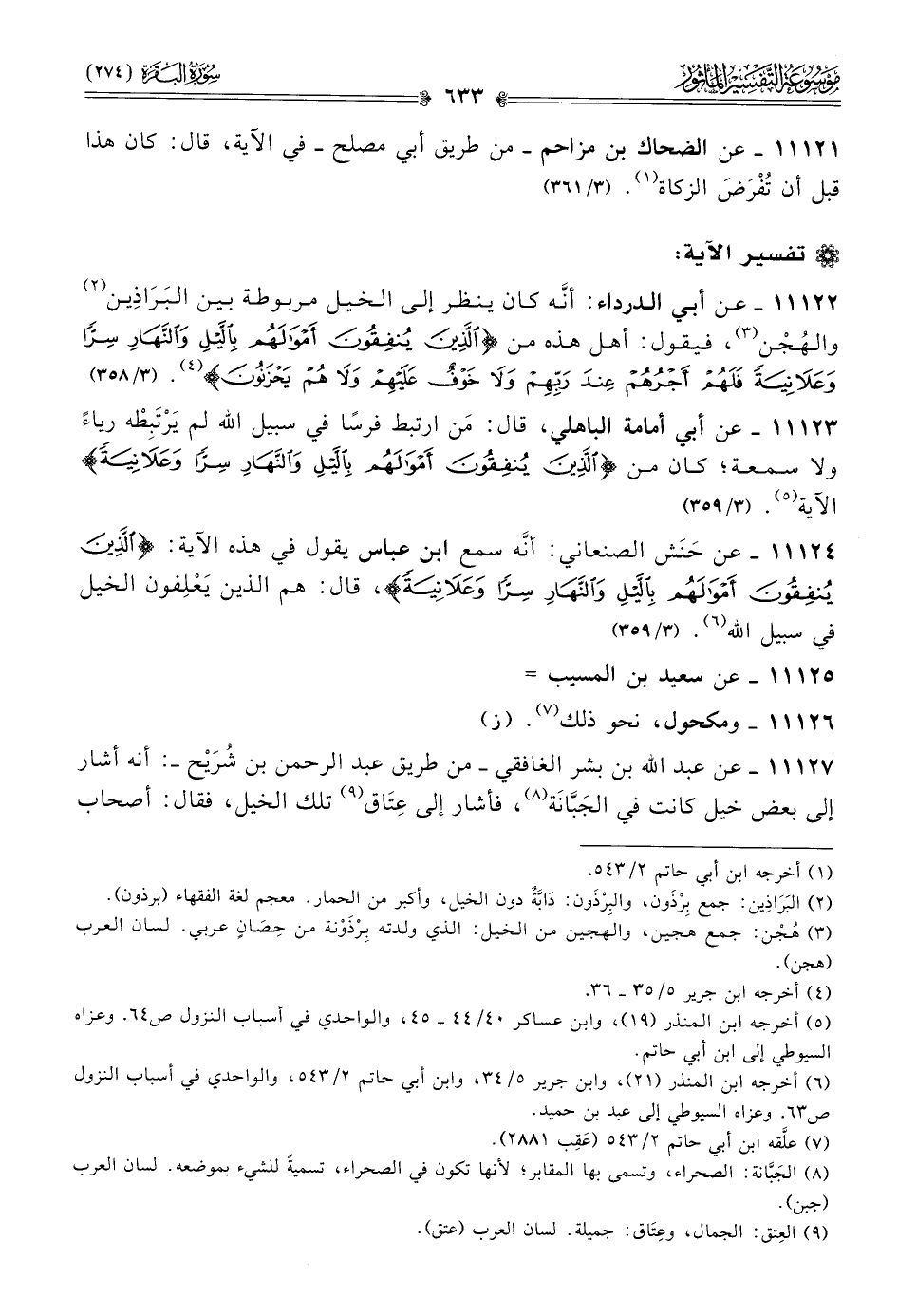 ١١١٢٢ - عن أبي الدرداء: أنّه كان ينظر إلى الخيل مربوطة بين البَراذِين (¬٢) والهُجْن (¬٣)، فيقول: أهل هذه من {الذين ينفقون أموالهم بالليل والنهار سرا وعلانية فلهم أجرهم عند ربهم ولا خوف عليهم ولا هم يحزنون} (¬٤). (٣/ ٣٥٨)