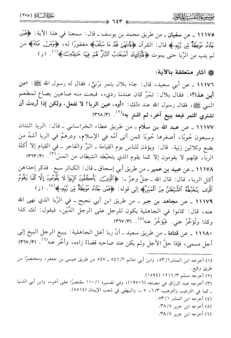 ١١١٧٥ - عن سفيان -من طريق محمد بن يوسف- قال: سمعنا في هذا الآية: {فمن جاءه موعظة من ربه فانتهى} قال: القرآن {فانتهى فله ما سلف} مغفورًا له، {ومن عاد} مَن لم يتب مِن الرِّبا حتى يموت {فأولئك أصحاب النار هم فيها خالدون} (¬١). (ز)