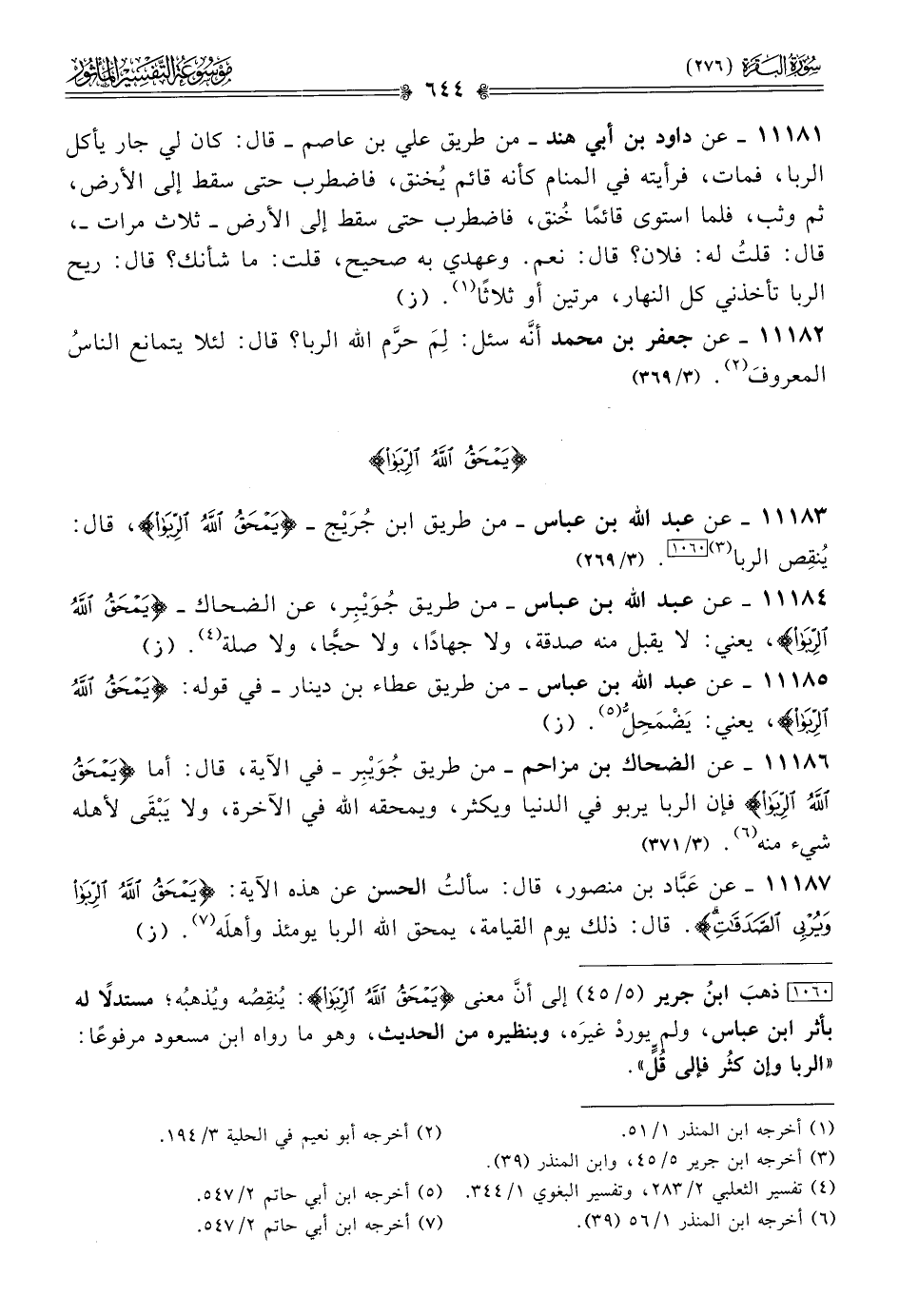 ١١١٨٣ - عن عبد الله بن عباس -من طريق ابن جُرَيْج- {يمحق الله الربا}، قال: يُنقِص الربا (¬٣) [١٠٦٠]. (٣/ ٣٦٩)