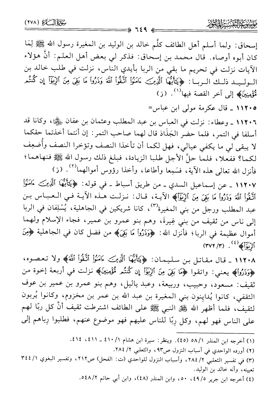 ١١٢٠٨ - قال مقاتل بن سليمان: {يا أيها الذين آمنوا اتقوا الله} ولا تعصوه، {وذروا} يعني: واتقوا {ما بقي من الربا إن كنتم مؤمنين} نزلت في أربعة إخوة من ثقيف: مسعود، وحبيب، وربيعة، وعبد ياليل، وهم بنو عمرو بن عمير بن عوف الثقفي، كانوا يُدايِنون بني المغيرة بن عبد الله بن عمر بن مخزوم، وكانوا يُربون لثقيف، فلما أظهر الله - عز وجل - النبي - صلى الله عليه وسلم - على الطائف اشترطت ثقيف أنّ كل ربًا لهم على الناس فهو لهم، وكل رِبًا للناس عليهم فهو موضوع عنهم، فطلبوا رِباهم إلى