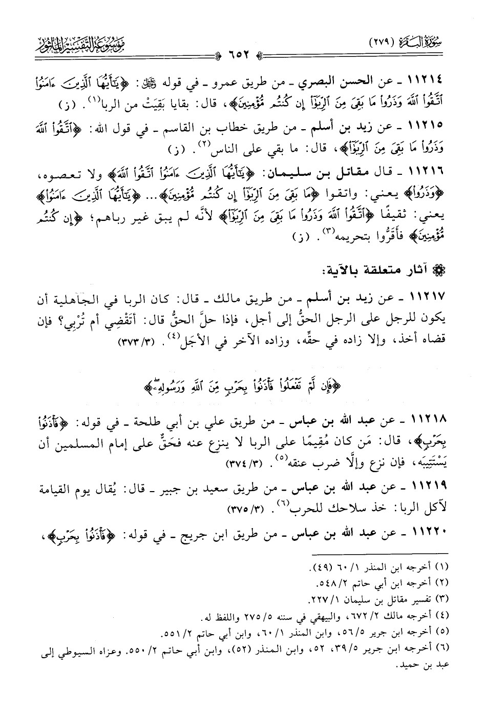 ١١٢١٨ - عن عبد الله بن عباس -من طريق علي بن أبي طلحة- في قوله: {فأذنوا بحرب}، قال: مَن كان مُقِيمًا على الربا لا ينزِع عنه فحَقٌّ على إمام المسلمين أن يَسْتَتِيبَه، فإن نزع وإلّا ضرب عنقه (¬٥). (٣/ ٣٧٤)