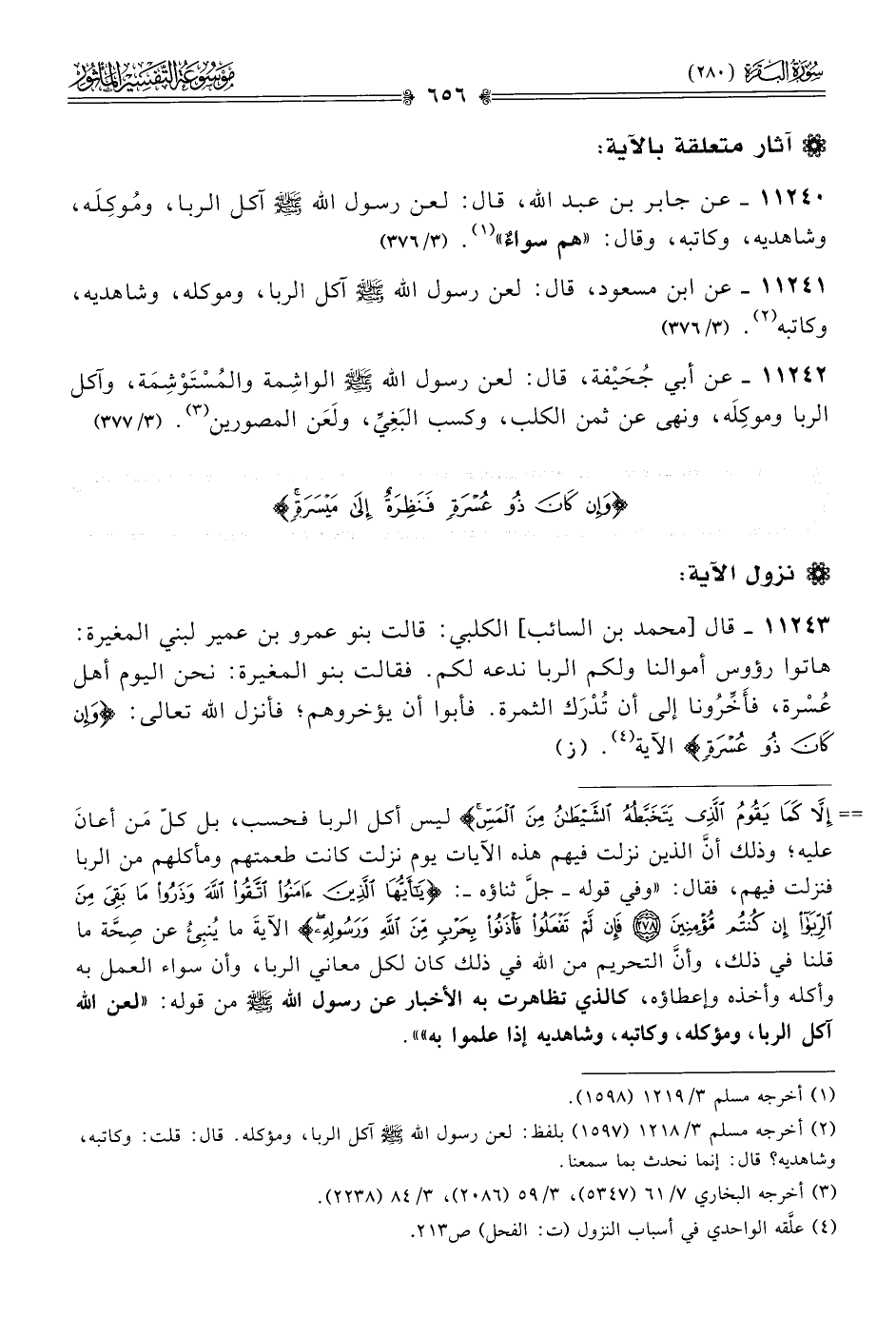 ١١٢٤٣ - قال [محمد بن السائب] الكلبي: قالت بنو عمرو بن عمير لبني المغيرة: هاتوا رءوس أموالنا ولكم الربا ندعه لكم. فقالت بنو المغيرة: نحن اليوم أهل عُسْرة، فأَخِّرُونا إلى أن تُدْرَك الثمرة. فأبوا أن يؤخروهم؛ فأنزل الله تعالى: {وإن كان ذو عسرة} الآية (¬٤). (ز)
