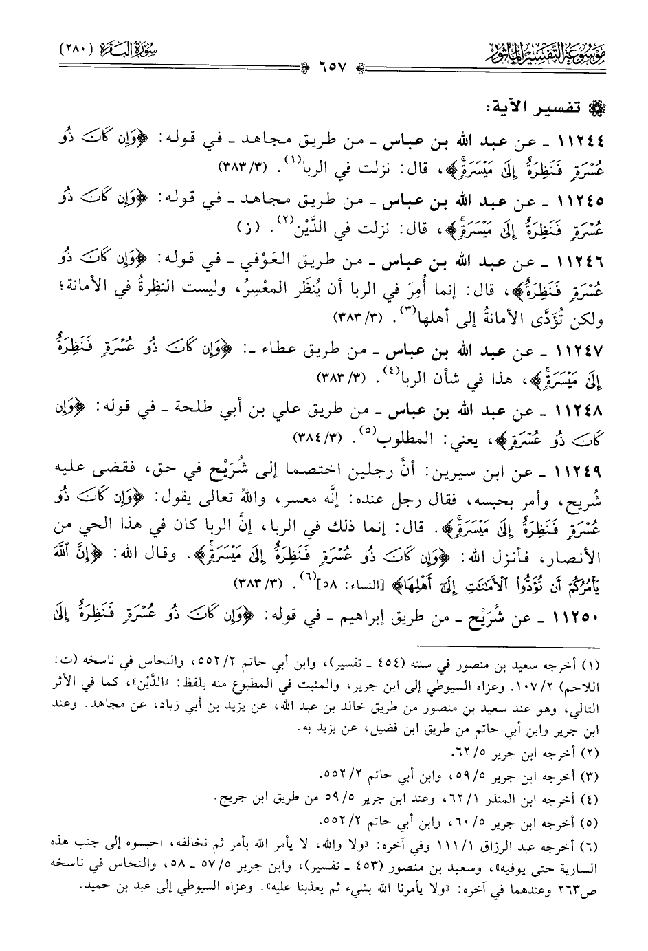 ١١٢٤٤ - عن عبد الله بن عباس -من طريق مجاهد- في قوله: {وإن كان ذو عسرة فنظرة إلى ميسرة}، قال: نزلت في الربا (¬١). (٣/ ٣٨٣)