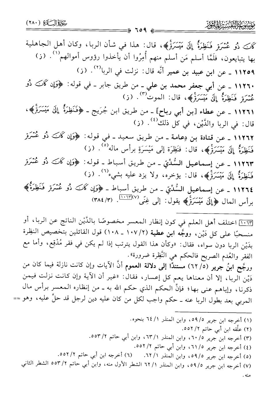 ١١٢٦٠ - عن أبي جعفر محمد بن علي -من طريق جابر- في قوله: {وإن كان ذو عسرة فنظرة إلى ميسرة}، قال: الموت (¬٣). (ز)