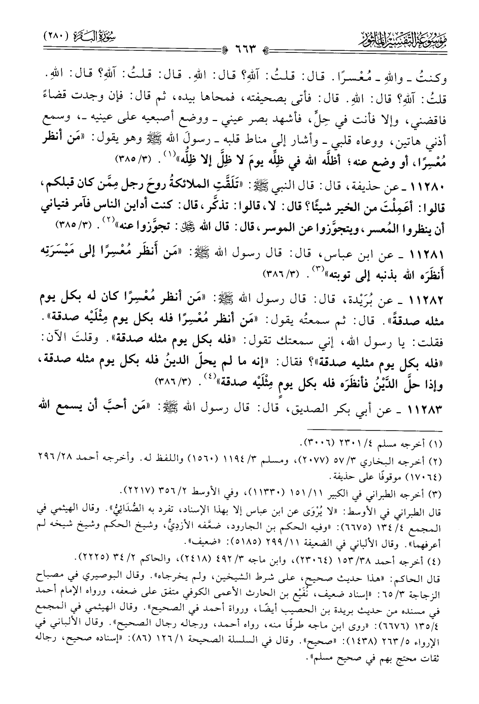 ١١٢٨١ - عن ابن عباس، قال: قال رسول الله - صلى الله عليه وسلم -: «مَن أنظَر مُعْسِرًا إلى مَيْسَرَتِه أنظَرَه الله بذنبه إلى توبته» (¬٣). (٣/ ٣٨٦)