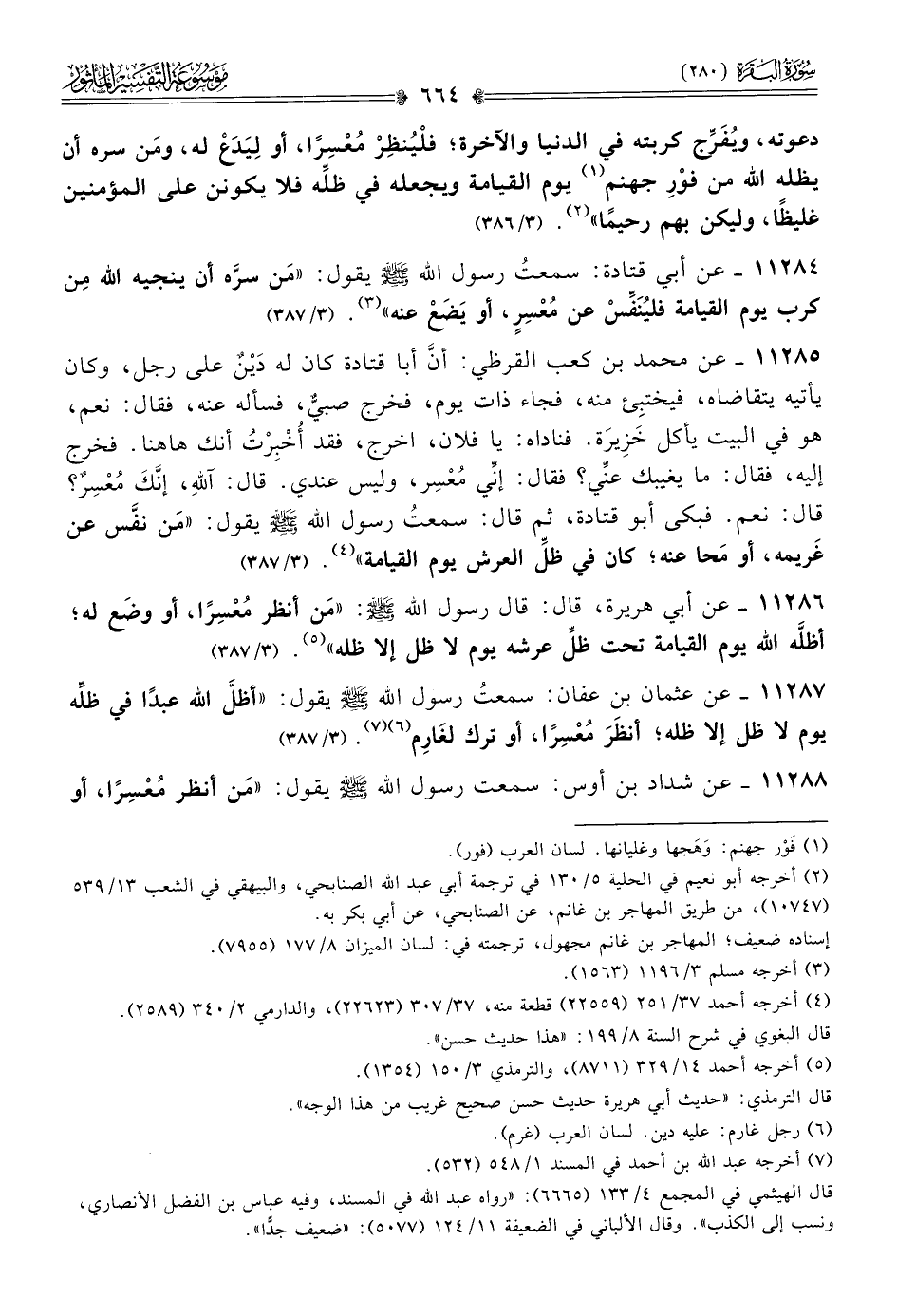١١٢٨٤ - عن أبي قتادة: سمعتُ رسول الله - صلى الله عليه وسلم - يقول: «مَن سرَّه أن ينجيه الله مِن كرب يوم القيامة فليُنَفِّسْ عن مُعْسِرٍ، أو يَضَعْ عنه» (¬٣). (٣/ ٣٨٧)