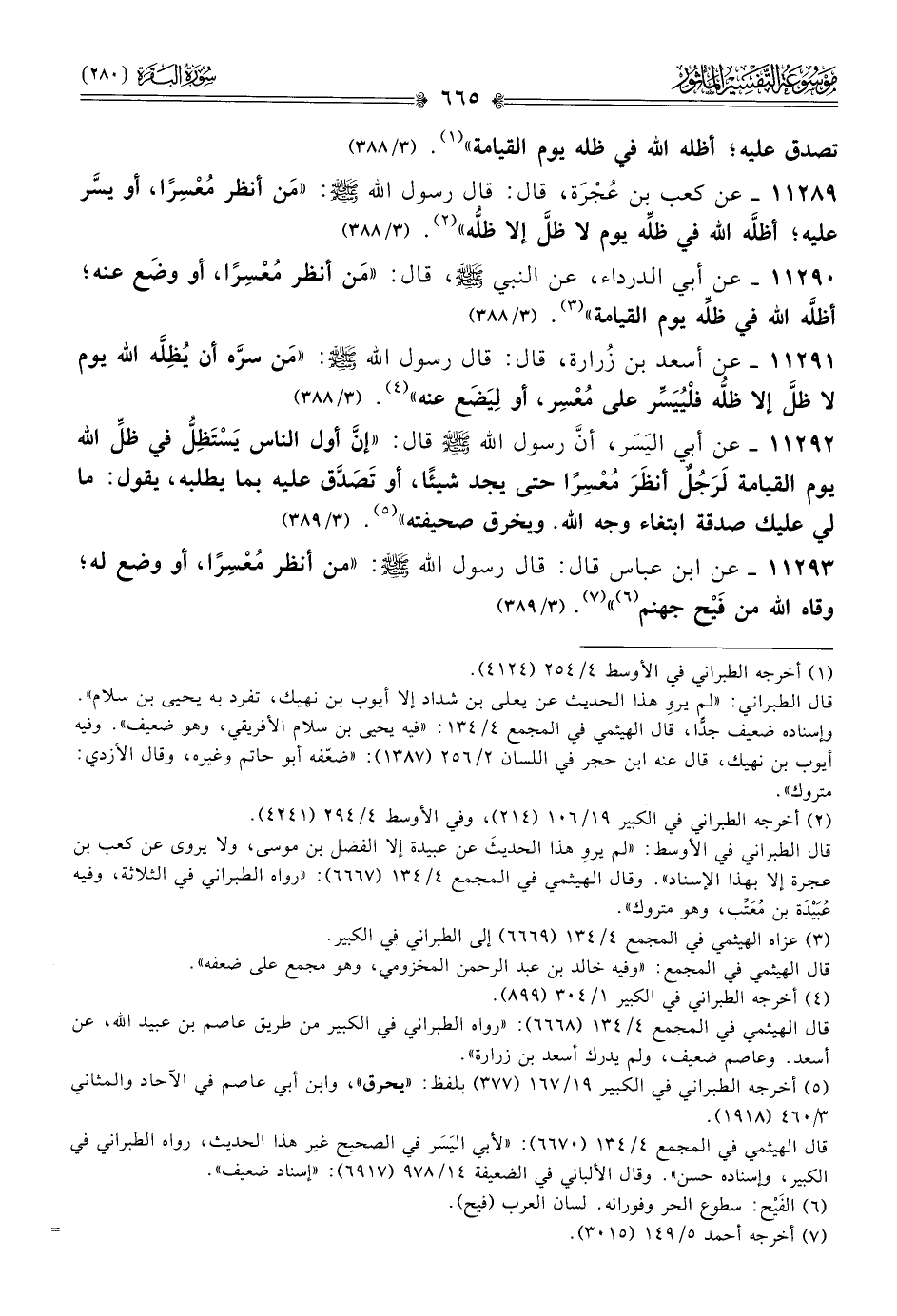 ١١٢٩٣ - عن ابن عباس قال: قال رسول الله - صلى الله عليه وسلم -: «من أنظر مُعْسِرًا، أو وضع له؛ وقاه الله من فَيْح جهنم (¬٦)» (¬٧). (٣/ ٣٨٩)