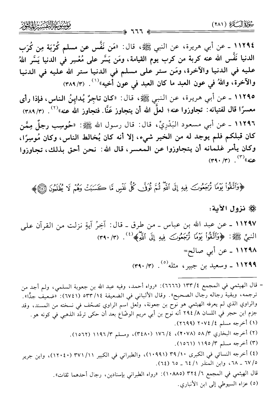 ١١٢٩٧ - عن عبد الله بن عباس -من طرق- قال: آخِرُ آيةٍ نزلت من القرآن على النبيِّ - صلى الله عليه وسلم -: {واتقوا يوما ترجعون فيه إلى الله} (¬٤). (٣/ ٣٩٠)
