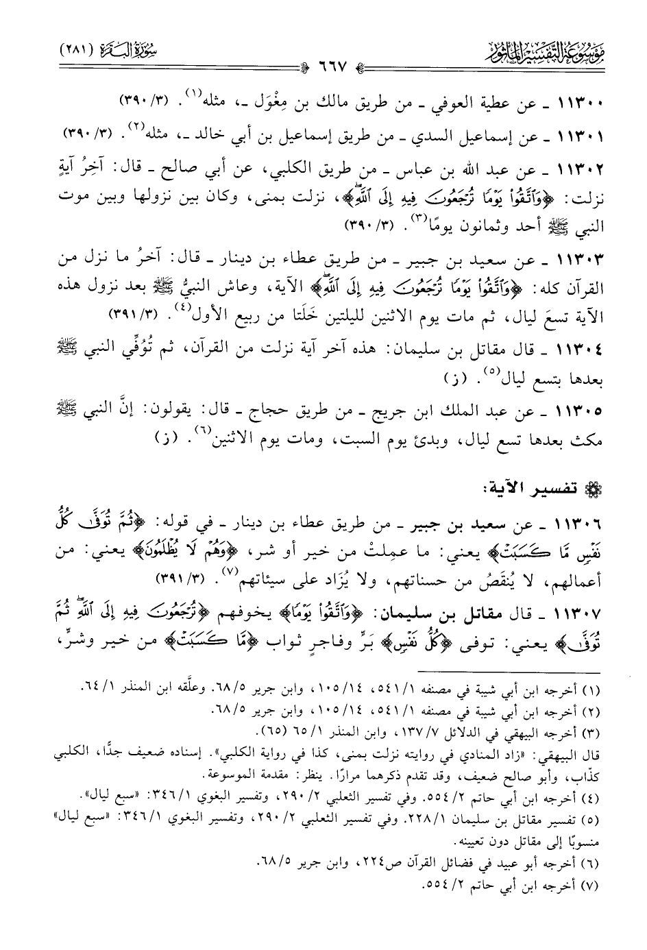 ١١٣٠٢ - عن عبد الله بن عباس -من طريق الكلبي، عن أبي صالح- قال: آخِرُ آيةٍ نزلت: {واتقوا يوما ترجعون فيه إلى الله}، نزلت بمنى، وكان بين نزولها وبين موت النبي - صلى الله عليه وسلم - أحد وثمانون يومًا (¬٣). (٣/ ٣٩٠)