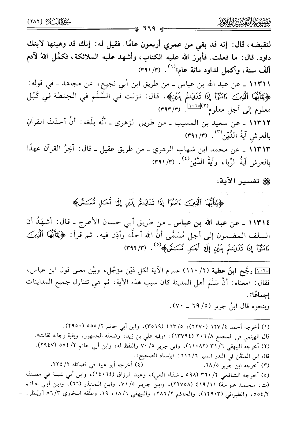 ١١٣١١ - عن عبد الله بن عباس -من طريق ابن أبي نجيح، عن مجاهد- في قوله: {يا أيها الذين آمنوا إذا تداينتم بدين}، قال: نزلت في السَّلَم في الحِنطة في كَيْل معلوم إلى أجل معلوم (¬٢) [١٠٦٥]. (٣/ ٣٩٣)