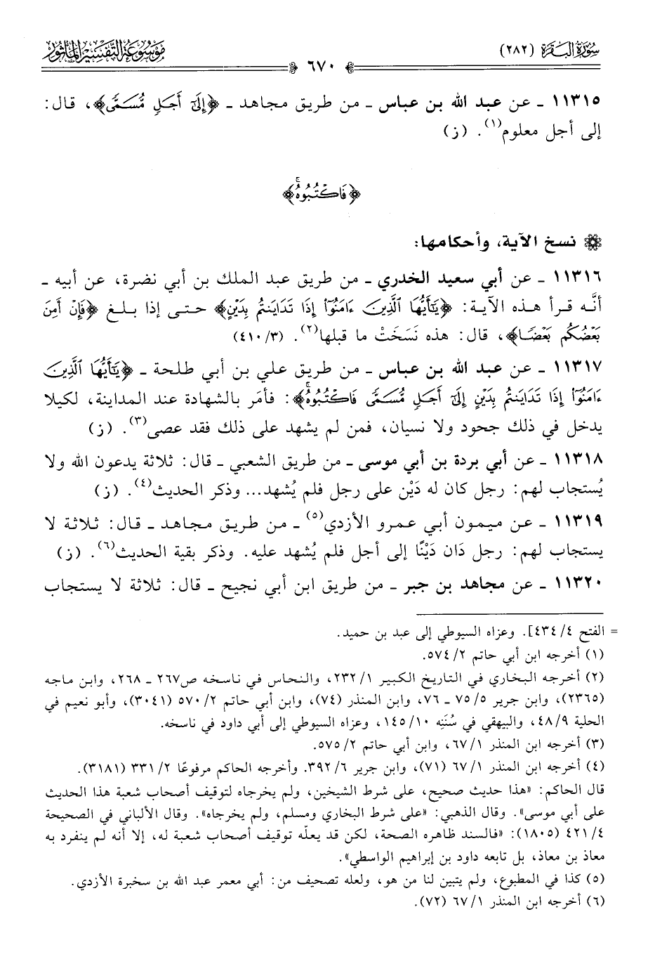 ١١٣١٦ - عن أبي سعيد الخدري -من طريق عبد الملك بن أبي نضرة، عن أبيه- أنّه قرأ هذه الآية: {يا أيها الذين آمنوا إذا تداينتم بدين} حتى إذا بلغ {فإن أمن بعضكم بعضا}، قال: هذه نَسَخَتْ ما قبلها (¬٢). (٣/ ٤١٠)