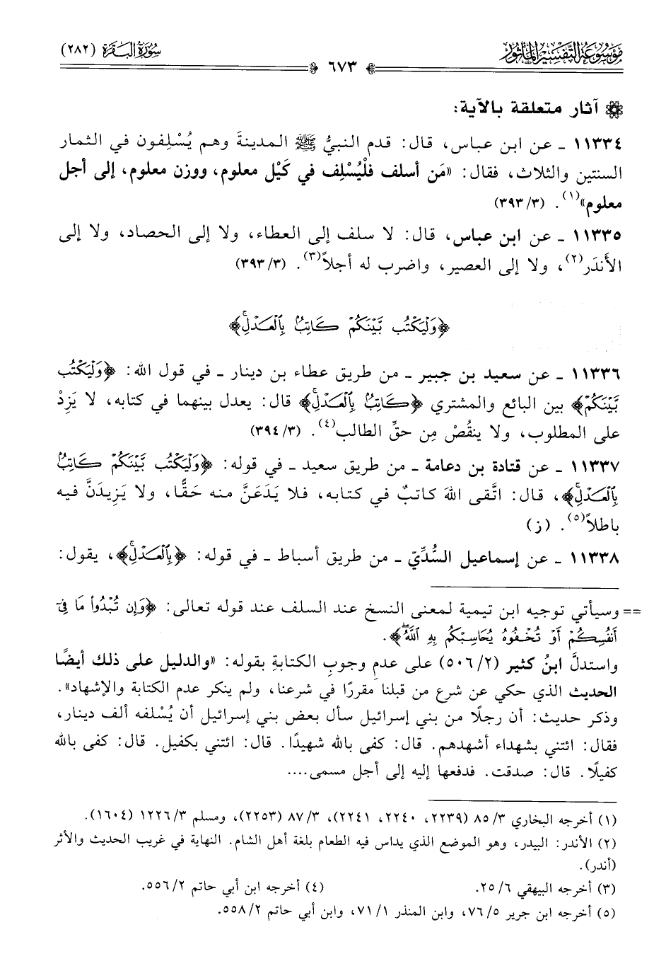 ١١٣٣٤ - عن ابن عباس، قال: قدم النبيُّ - صلى الله عليه وسلم - المدينةَ وهم يُسْلِفون في الثمار السنتين والثلاث، فقال: «مَن أسلف فلْيُسْلِف في كَيْل معلوم، ووزن معلوم، إلى أجل معلوم» (¬١). (٣/ ٣٩٣)
