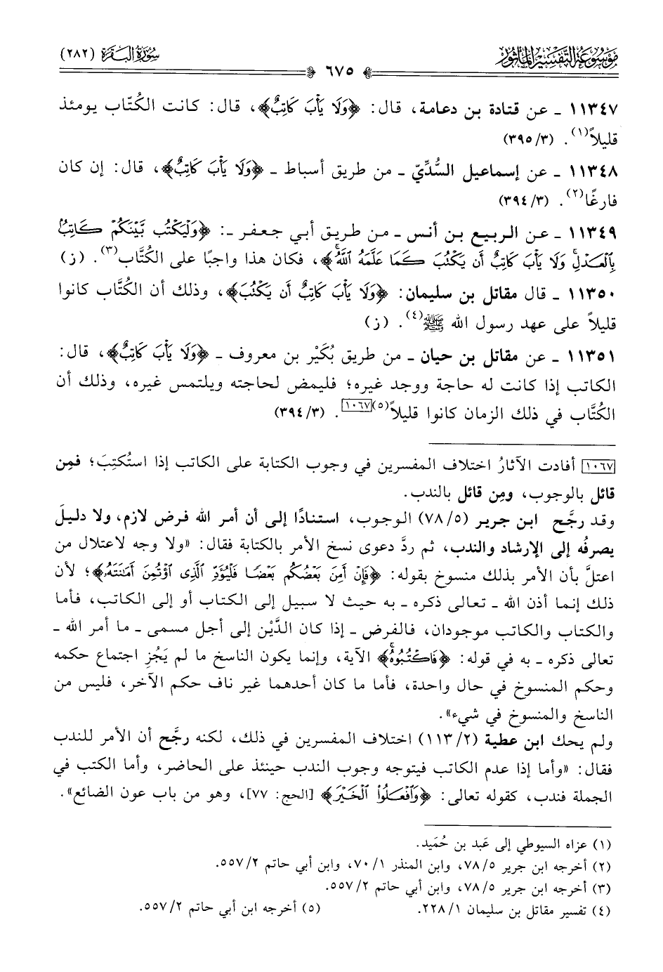 ١١٣٤٧ - عن قتادة بن دعامة، قال: {ولا يأب كاتب}، قال: كانت الكُتّاب يومئذ قليلًا (¬١). (٣/ ٣٩٥)