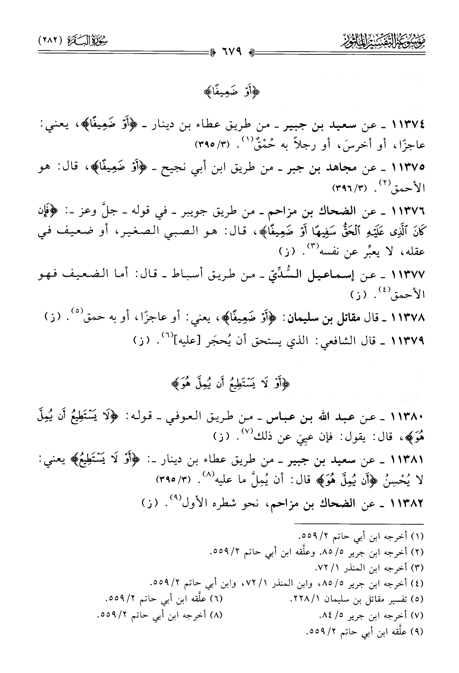 ١١٣٧٦ - عن الضحاك بن مزاحم -من طريق جويبر- في قوله -جلَّ وعز-: {فإن كان الذي عليه الحق سفيها أو ضعيفا}، قال: هو الصبي الصغير، أو ضعيف في عقله، لا يعبِّر عن نفسه (¬٣). (ز)