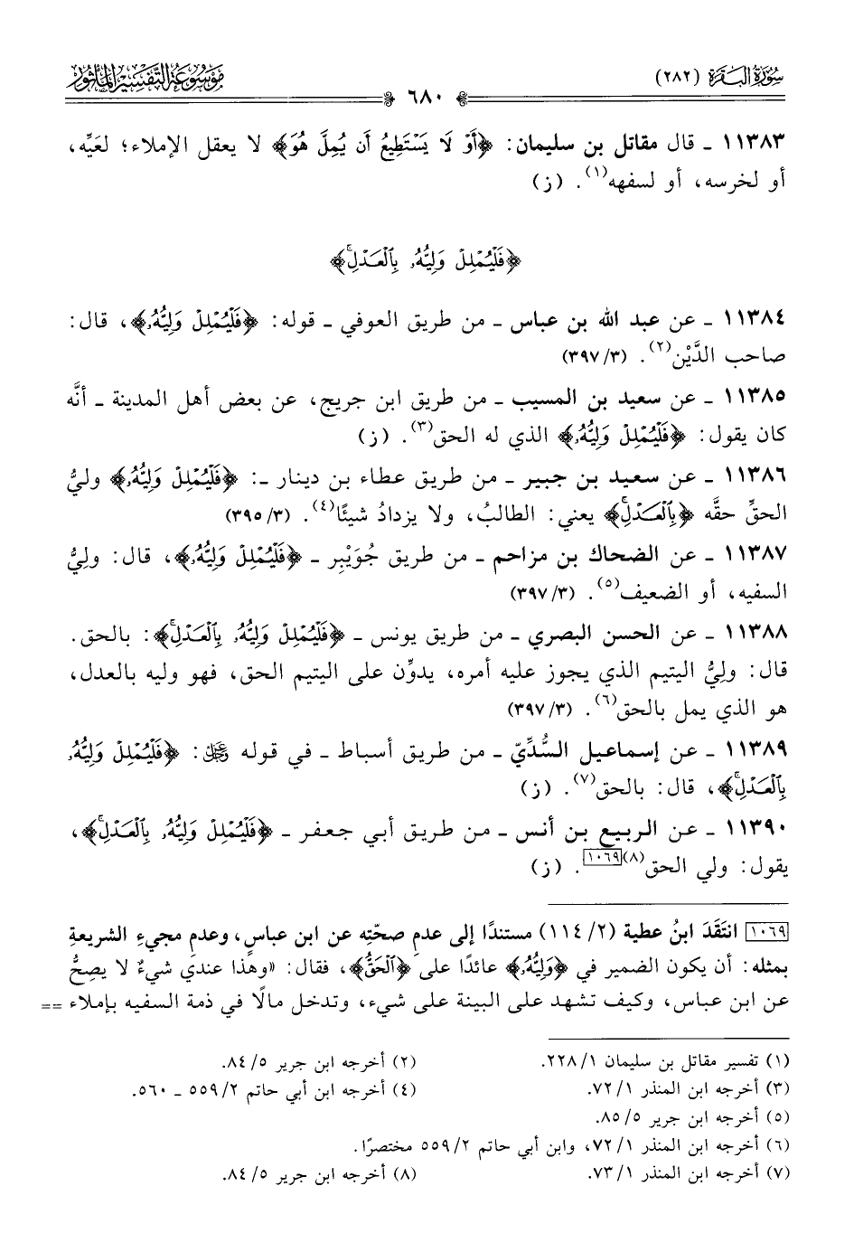 ١١٣٨٦ - عن سعيد بن جبير -من طريق عطاء بن دينار-: {فليملل وليه} وليُّ الحقِّ حقَّه {بالعدل} يعني: الطالبُ، ولا يزدادُ شيئًا (¬٤). (٣/ ٣٩٥)