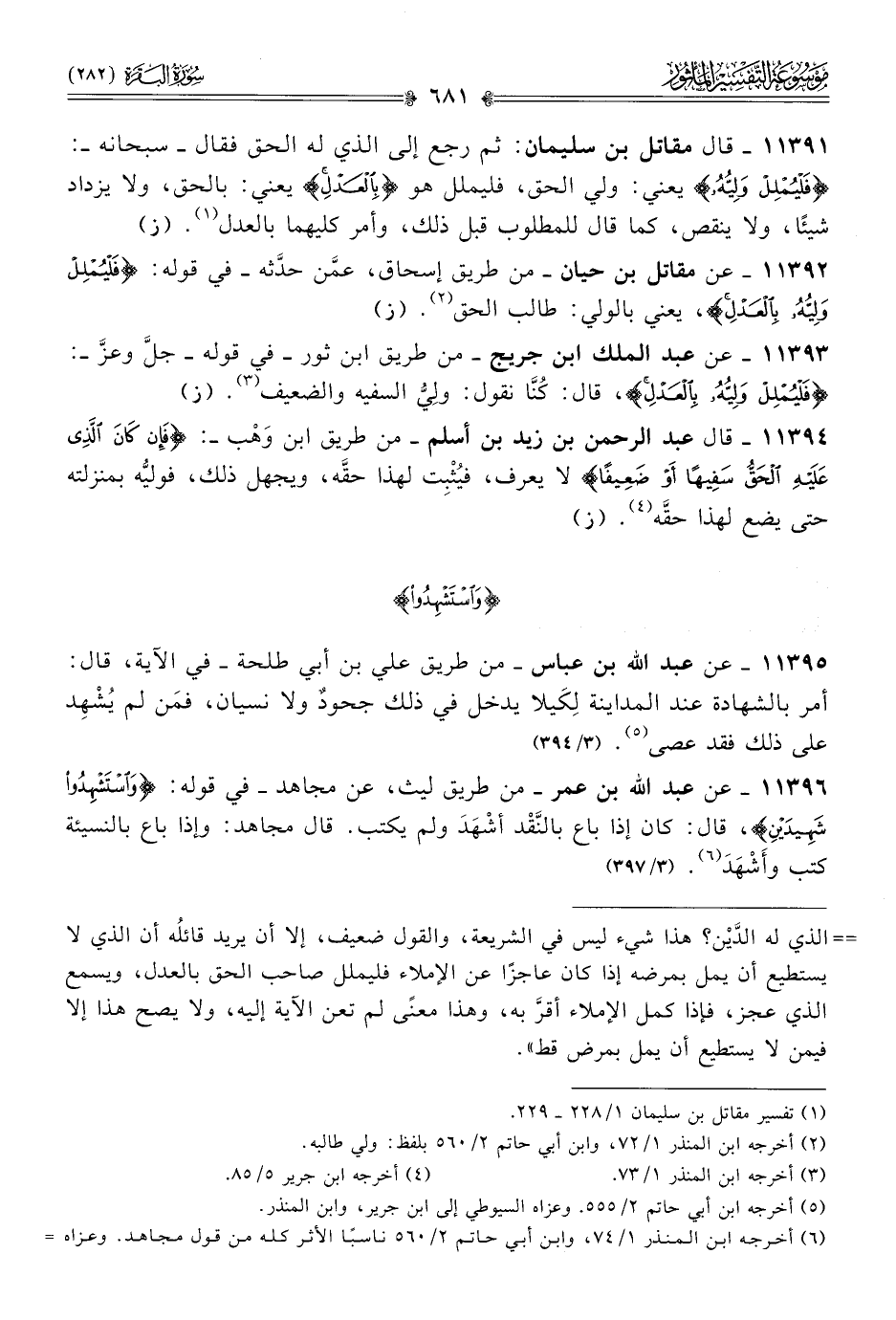 ١١٣٩٤ - قال عبد الرحمن بن زيد بن أسلم -من طريق ابن وهْب-: {فإن كان الذي عليه الحق سفيها أو ضعيفا} لا يعرف، فيُثْبِت لهذا حقَّه، ويجهل ذلك، فوليُّه بمنزلته حتى يضع لهذا حقَّه (¬٤). (ز)