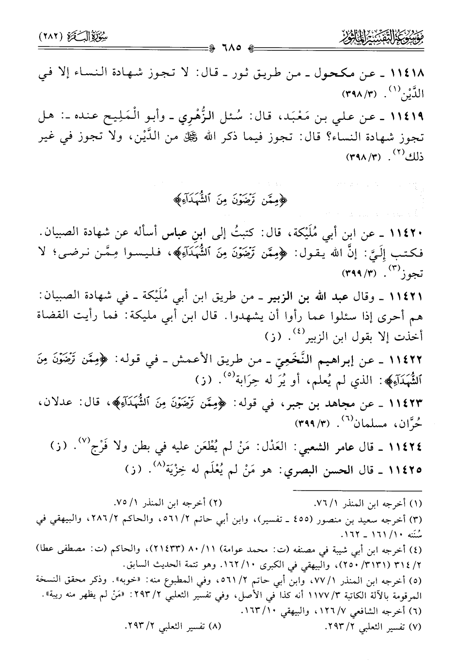 ١١٤٢٣ - عن مجاهد بن جبر، في قوله: {ممن ترضون من الشهداء}، قال: عدلان، حُرّان، مسلمان (¬٦). (٣/ ٣٩٩)