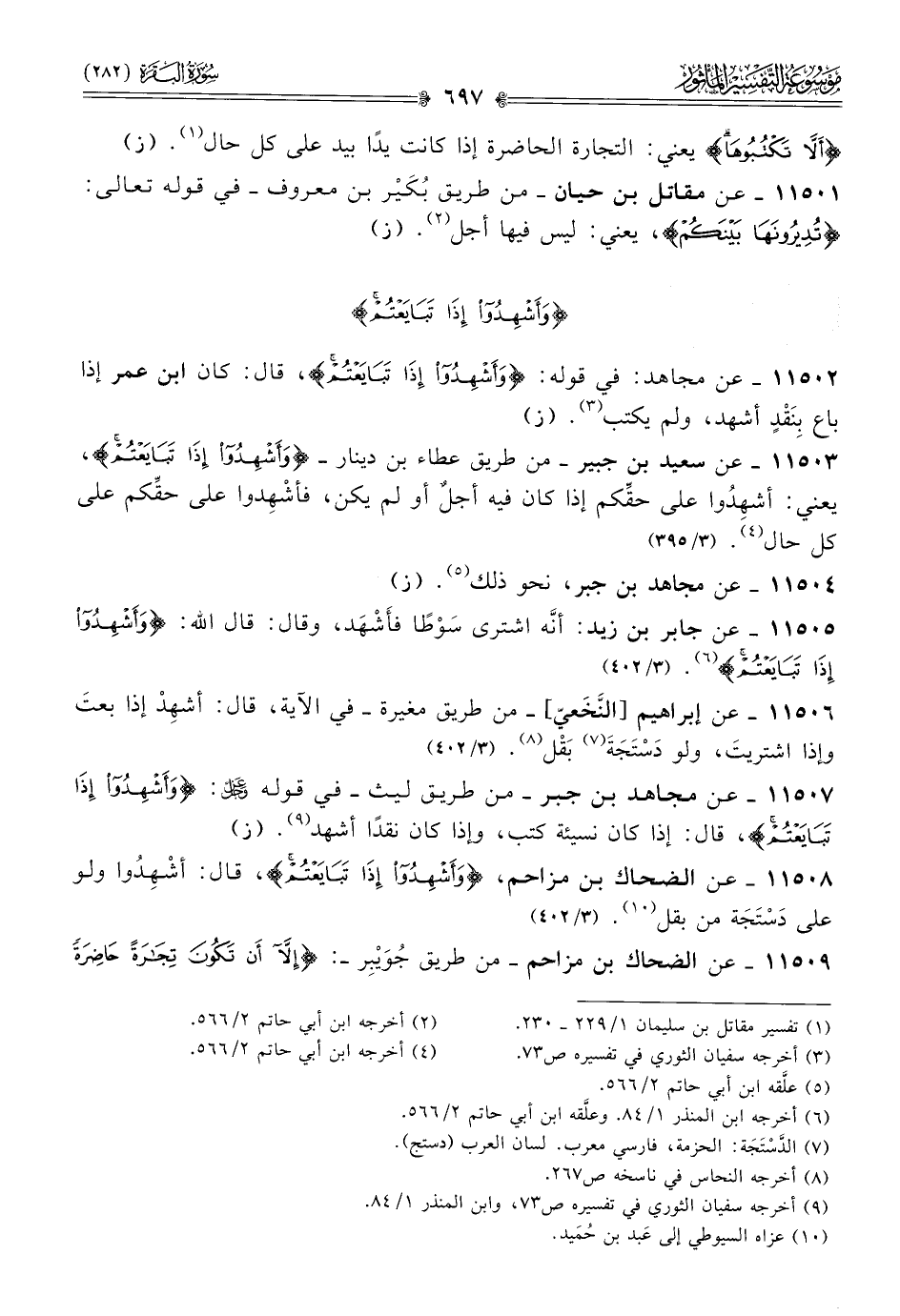 ١١٥٠٣ - عن سعيد بن جبير -من طريق عطاء بن دينار- {وأشهدوا إذا تبايعتم}، يعني: أشهِدُوا على حقِّكم إذا كان فيه أجلٌ أو لم يكن، فأشْهِدوا على حقِّكم على كل حال (¬٤). (٣/ ٣٩٥)