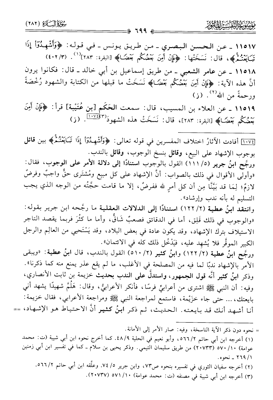 ١١٥١٧ - عن الحسن البصري -من طريق يونس- في قوله: {وأشهدوا إذا تبايعتم}، قال: نَسَخَتْها: {فإن أمن بعضكم بعضا} [البقرة: ٢٨٣] (¬١). (٣/ ٤٠٢)