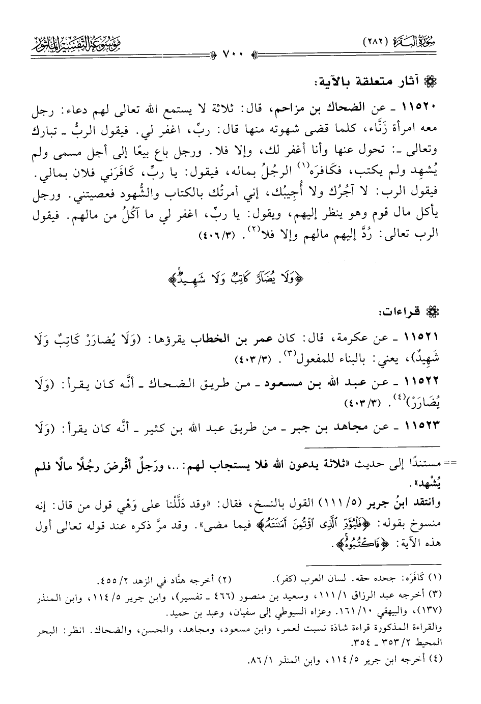 ١١٥٢١ - عن عكرمة، قال: كان عمر بن الخطاب يقرؤها: (ولا يُضارَرْ كاتِبٌ ولا شَهِيدٌ)، يعني: بالبناء للمفعول (¬٣). (٣/ ٤٠٣)