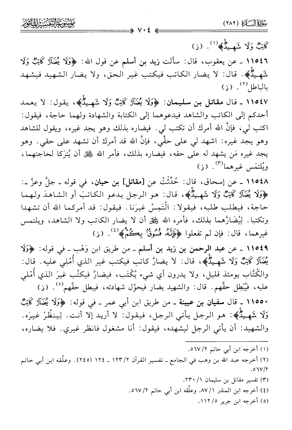 ١١٥٤٩ - عن عبد الرحمن بن زيد بن أسلم -من طريق ابن وهْب- في قوله: {ولا يضار كاتب ولا شهيد}، قال: لا يضارَّ كاتب فيكتب غير الذي أُمْلِي عليه. قال: والكُتاَّب يومئذ قليل، ولا يدرون أي شيء يُكْتَب، فيضارَّ فيكتُب غيرَ الذي أُمْلي عليه، فيُبْطِل حقَّهم. قال: والشهيد يضار فيحوَّل شهادته، فيبطل حقَّهم (¬٥). (ز)