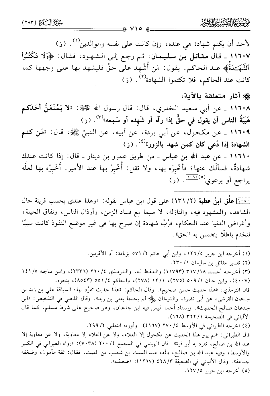 [١٠٨٠] علَّق ابنُ عطية (٢/ ١٣١) على قول ابن عباس بقوله: «وهذا عندي بحسب قرينة حال الشاهد، والمشهود فيه، والنازلة، لا سيما مع فساد الزمن، وأرذال الناس، ونفاق الحيلة، وأغراض الدنيا عند الحكام، فرُبَّ شهادة إن صرح بها في غير موضع النفوذ كانت سببًا لتخدم باطلًا ينطمس به الحق».