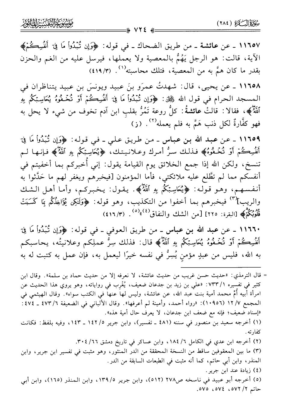 ١١٦٥٧ - عن عائشة -من طريق الضحاك- في قوله: {وَإِنْ تُبْدُوا مَا فِي أَنْفُسِكُمْ} الآية، قالت: هو الرجل يَهُمُّ بالمعصية ولا يعملها، فيرسل عليه من الغم والحزن بقدر ما كان همَّ به من المعصية، فتلك محاسبته (¬١). (٣/ ٤١٩)