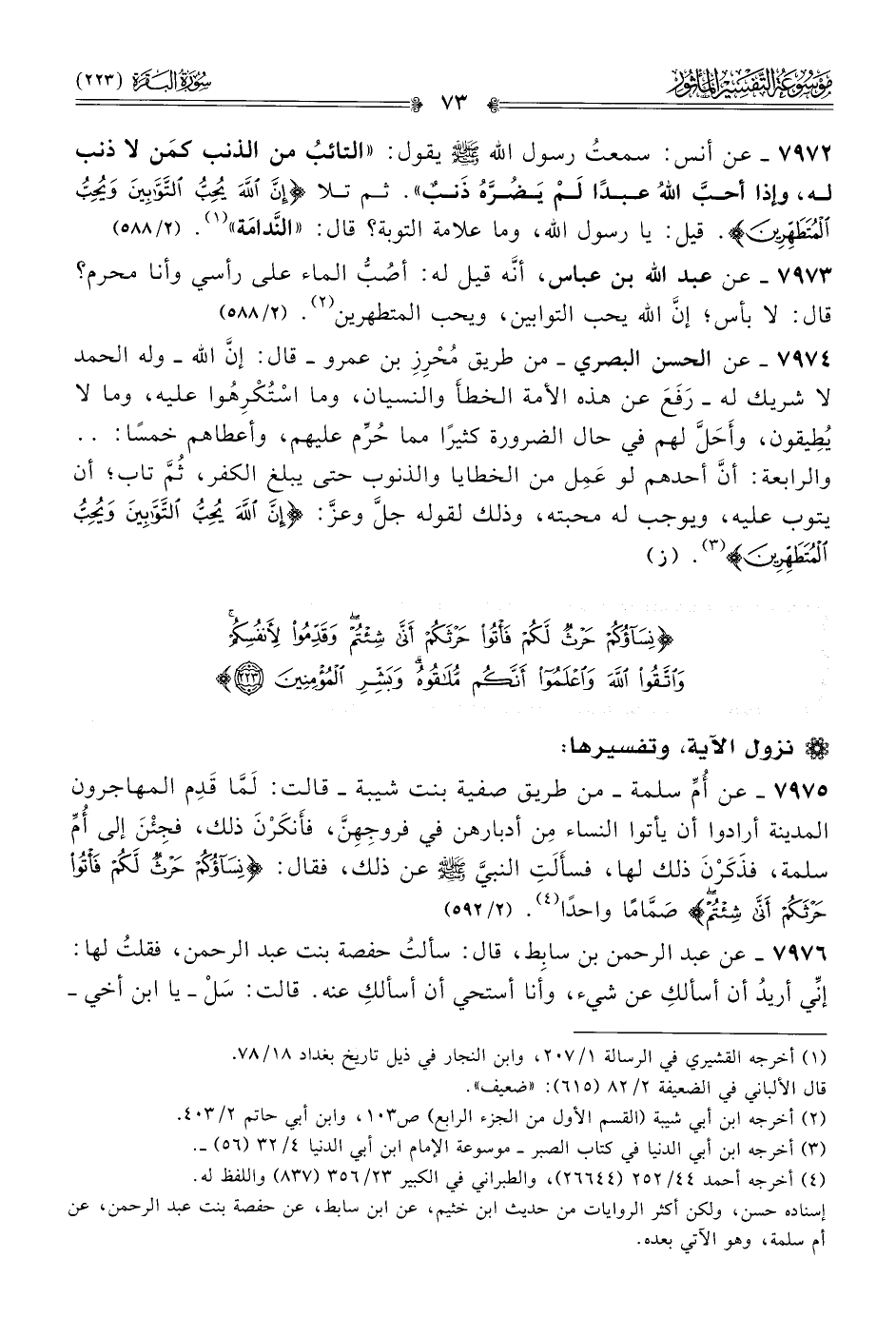 ٧٩٧٥ - عن أُمِّ سلمة -من طريق صفية بنت شيبة- قالت: لَمّا قَدِم المهاجرون المدينة أرادوا أن يأتوا النساء مِن أدبارهن في فروجِهِنَّ، فأَنكَرْنَ ذلك، فجِئْنَ إلى أُمِّ سلمة، فذَكَرْنَ ذلك لها، فسأَلَتِ النبيَّ - صلى الله عليه وسلم - عن ذلك، فقال: {نساؤكم حرث لكم فأتوا حرثكم أنى شئتم} صَمّامًا واحدًا (¬٤). (٢/ ٥٩٢)