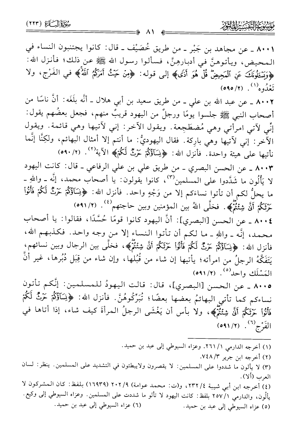 ٨٠٠٣ - عن الحسن البصري -من طريق علي بن علي الرفاعي- قال: كانت اليهود لا يَأْلُون ما شَدَّدوا على المسلمين (¬٣)، كانوا يقولون: يا أصحاب محمد، إنّه -واللهِ- ما يحلُّ لكم أن تأتوا نساءَكم إلا من وجْهٍ واحد. فأنزل الله: {نساؤكم حرث لكم فأتوا حرثكم أنى شئتم}. فخلّى اللهُ بين المؤمنين وبين حاجتهم (¬٤). (٢/ ٥٩١)
