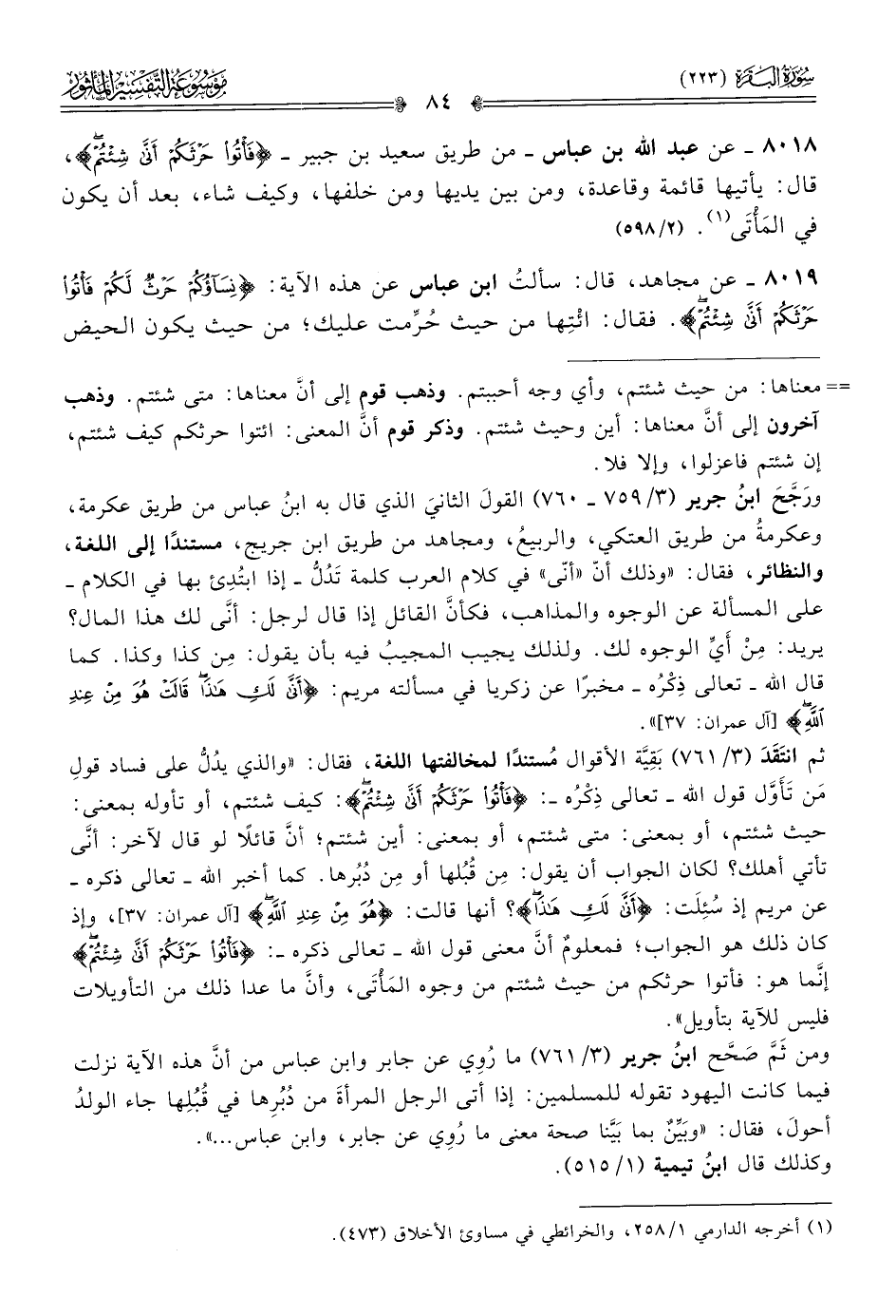 ٨٠١٩ - عن مجاهد، قال: سألتُ ابن عباس عن هذه الآية: {نساؤكم حرث لكم فأتوا حرثكم أنى شئتم}. فقال: ائْتِها من حيث حُرِّمت عليك؛ من حيث يكون الحيض