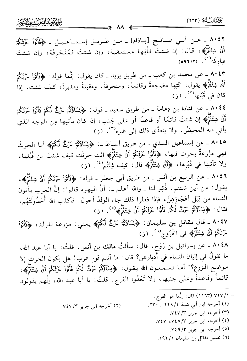 ٨٠٤٤ - عن قتادة بن دِعامة -من طريق سعيد- قوله: {نساؤكم حرث لكم فأتوا حرثكم أنى شئتم} إن شئتَ قائمًا أو قاعدًا أو على جَنب، إذا كان يأتيها مِن الوجه الذي يأتي منه المحيضُ، ولا يتعدّى ذلك إلى غيره (¬٣). (ز)