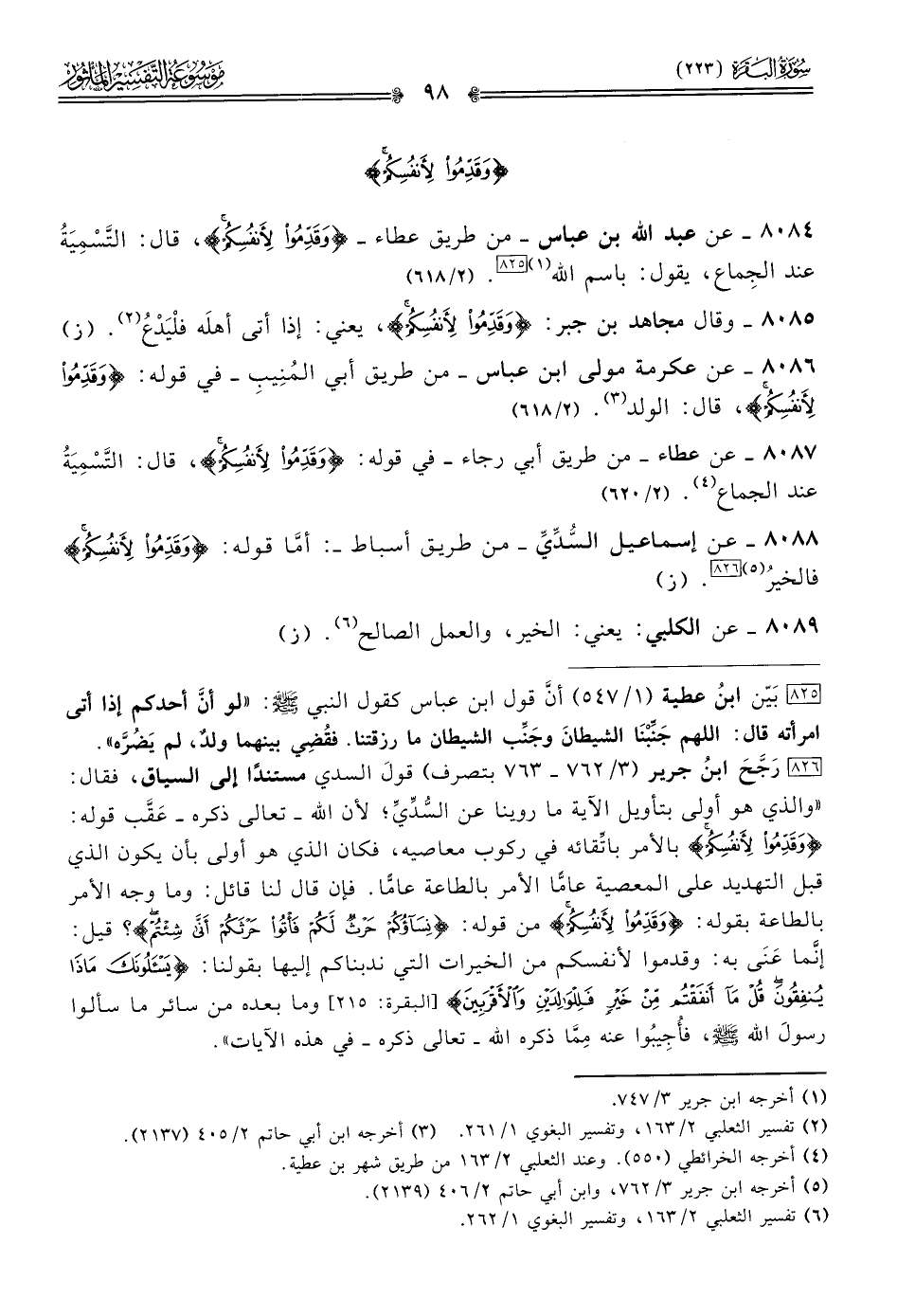 [٨٢٦] رَجَّحَ ابنُ جرير (٣/ ٧٦٢ - ٧٦٣ بتصرف) قولَ السدي مستندًا إلى السياق، فقال: «والذي هو أولى بتأويل الآية ما روينا عن السُّدِّيِّ؛ لأن الله -تعالى ذكره- عَقَّب قوله: {وقدموا لأنفسكم} بالأمر باتِّقائه في ركوب معاصيه، فكان الذي هو أولى بأن يكون الذي قبل التهديد على المعصية عامًّا الأمر بالطاعة عامًّا. فإن قال لنا قائل: وما وجه الأمر بالطاعة بقوله: {وقدموا لأنفسكم} من قوله: {نساؤكم حرث لكم فأتوا حرثكم أنى شئتم}؟ قيل: إنّما عَنى به: وقدموا لأنفسكم من الخيرات التي ندبناكم إليها بقولنا: {يسألونك ماذا ينفقون قل ما أنفقتم من خير فللوالدين والأقربين} [البقرة: ٢١٥] وما بعده من سائر ما سألوا رسولَ الله - صلى الله عليه وسلم -، فأُجِيبُوا عنه مِمّا ذكره الله -تعالى ذكره- في هذه الآيات».
