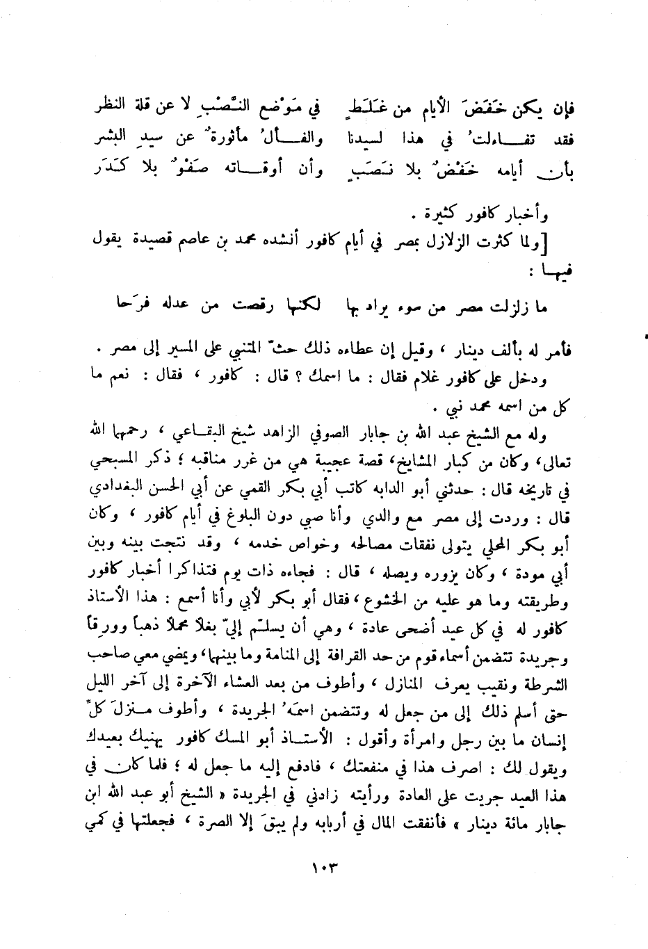 بأن أيامه خفض بلا نصب ... وأن أوقاته صفر بلا كدر وأخبار كافور كثيرة.