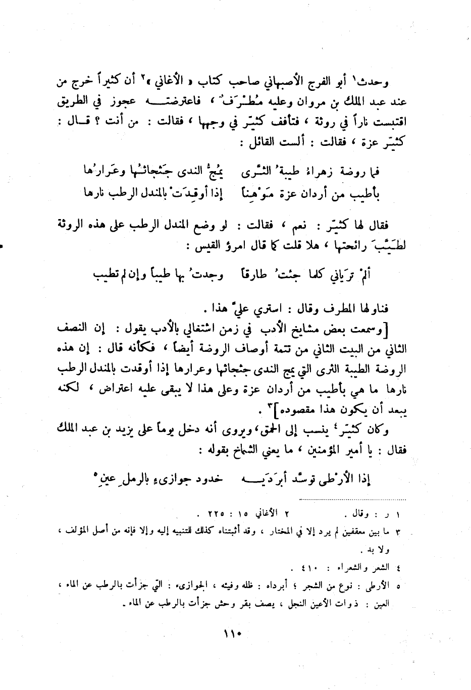 وحدث (1) أبو الفرج الأصبهاني صاحب كتاب " الأغاني " (2) أن كثيرا خرج من عند عبد الملك بن مروان وعليه مطرف، فاعترضته عجوز في الطريق اقتبست نارا في روثة، فتأفف كثير في وجهها، فقالت: من أنت قال: كثير عزة، فقالت: ألست القائل: