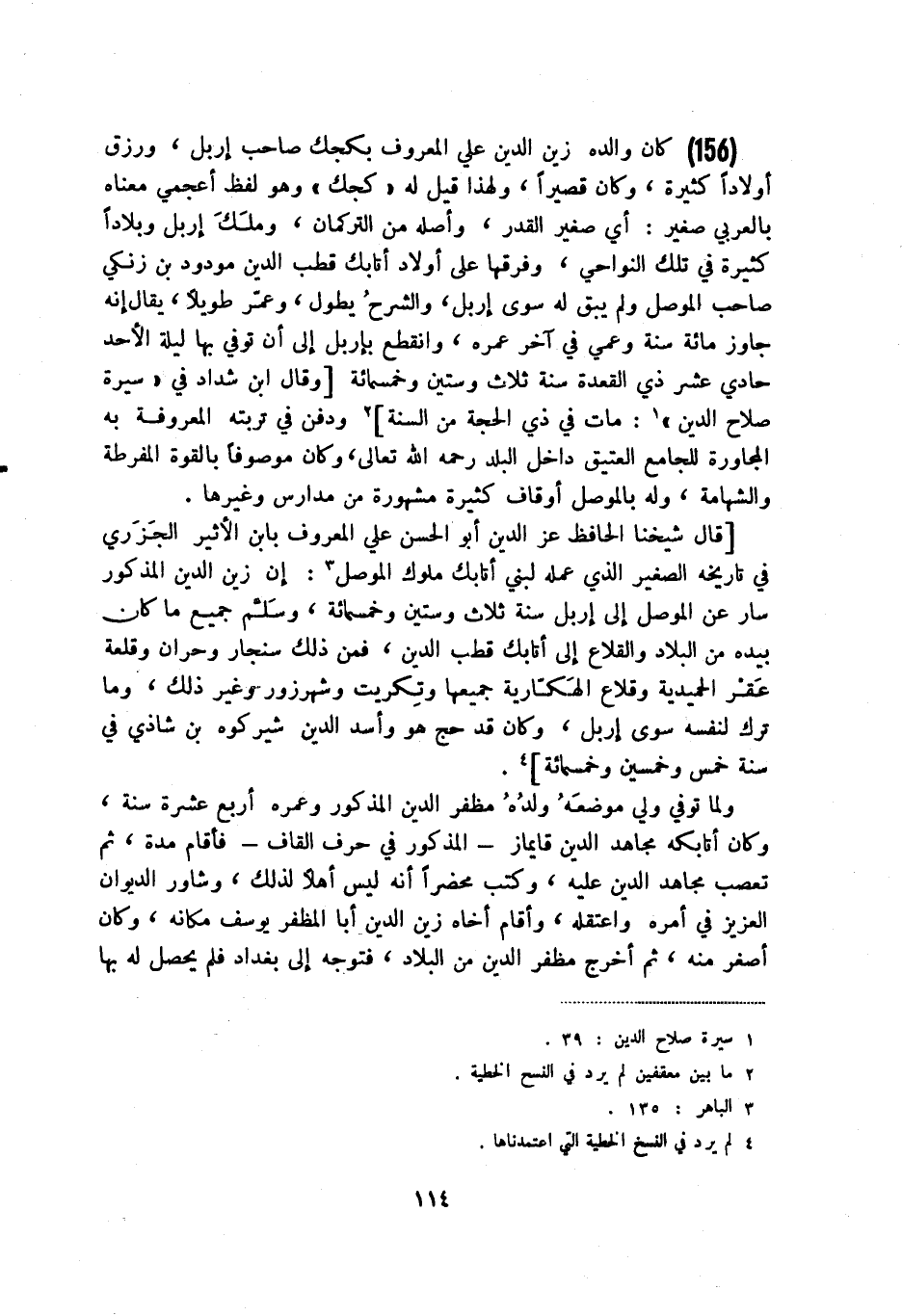 (156) كان والده زين الدين علي المعروف بكجك صاحب إربل، ورزق أولادا كثيرة، وكان قصيرا، ولهذا قيل له كجك وهو لفظ أعجمي معناه بالعربي صغير: أي صغير القدر، وأصله من التركمان، وملك إربل وبلادا كثيرة في تلك النواحي، وفرقها على أولاد أتابك قطب الدين مودود بن زنكي صاحب الموصل ولم يبق له سوى إربل، والشرح يطول، وعمر طويلا، يقال إنه جاوز مائة سنة وعمي في آخر عمره، وانقطع بإربل إلى أن توفي بها ليلة الأحد حادي عشر ذي القعدة سنة ثلاث وستين وخمسمائة [وقال ابن شداد في " سيرة صلاح الدين " (1) : مات في ذي الحجة من السنة] (2) ودفن في تربته المعروفة به المجاورة للجامع العتيق داخل البلد رحمه الله تعالى، وكان موصوفا بالقوة المفرطة والشهامة، وله بالموصل أوقاف كثيرة مشهورة من مدارس وغيرها.