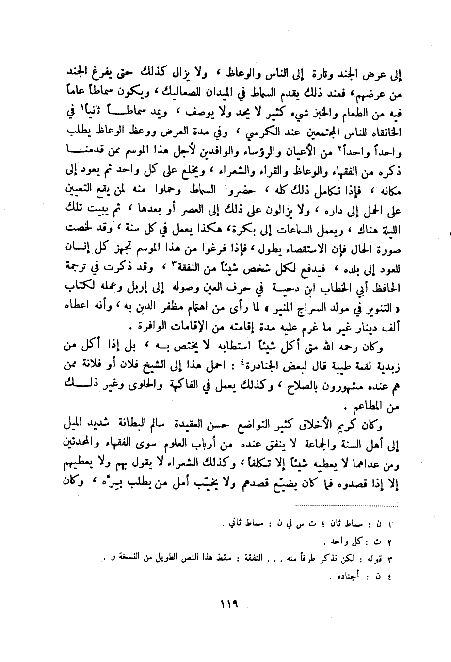 إلى عرض الجند وتارة إلى الناس والوعاظ، ولا يزال كذلك حتى يفرغ الجند من عرضهم، فعند ذلك يقدم السماط في الميدان للصعاليك، ويكون سماطا عاما فيه من الطعام والخبز شيء كثير لا يحد ولا يوصف، ويمد سماطا ثانيا (1) في الخانقاه للناس المجتمعين عند الكرسي، وفي مدة العرض ووعظ الوعاظ يطلب واحدا واحدا (2) من الأعيان والرؤساء والوافدين لأجل هذا الموسم ممن قدمنا ذكره من الفقهاء والوعاظ والقراء والشعراء، ويخلع على كل واحد ثم يعود إلى مكانه، فإذا تكامل ذلك كله، حضروا السماط وحملوا منه لمن يقع التعيين على الحمل إلى داره، ولا يزالون على ذلك إلى العصر أو بعدها، ثم يبيت تلك الليلة هناك، ويعمل السماعات إلى بكرة، هكذا يعمل في كل سنة، وقد لخصت صورة الحال فإن الاستقصاء يطول، فإذا فرغوا من هذا الموسم تجهز كل إنسان للعود إلى بلده، فيدفع لكل شخص شيئا من النفقة (3) ، وقد ذكرت في ترجمة الحافظ أبي الخطاب ابن دحية في حرف العين وصوله إلى إربل وعمله لكتاب التنوير في مولد السراج المنير لما رأى من اهتمام مظفر الدين به، وأنه أعطاه ألف دينار غير ما غرم عليه مدة إقامته من الإقامات الوافرة.