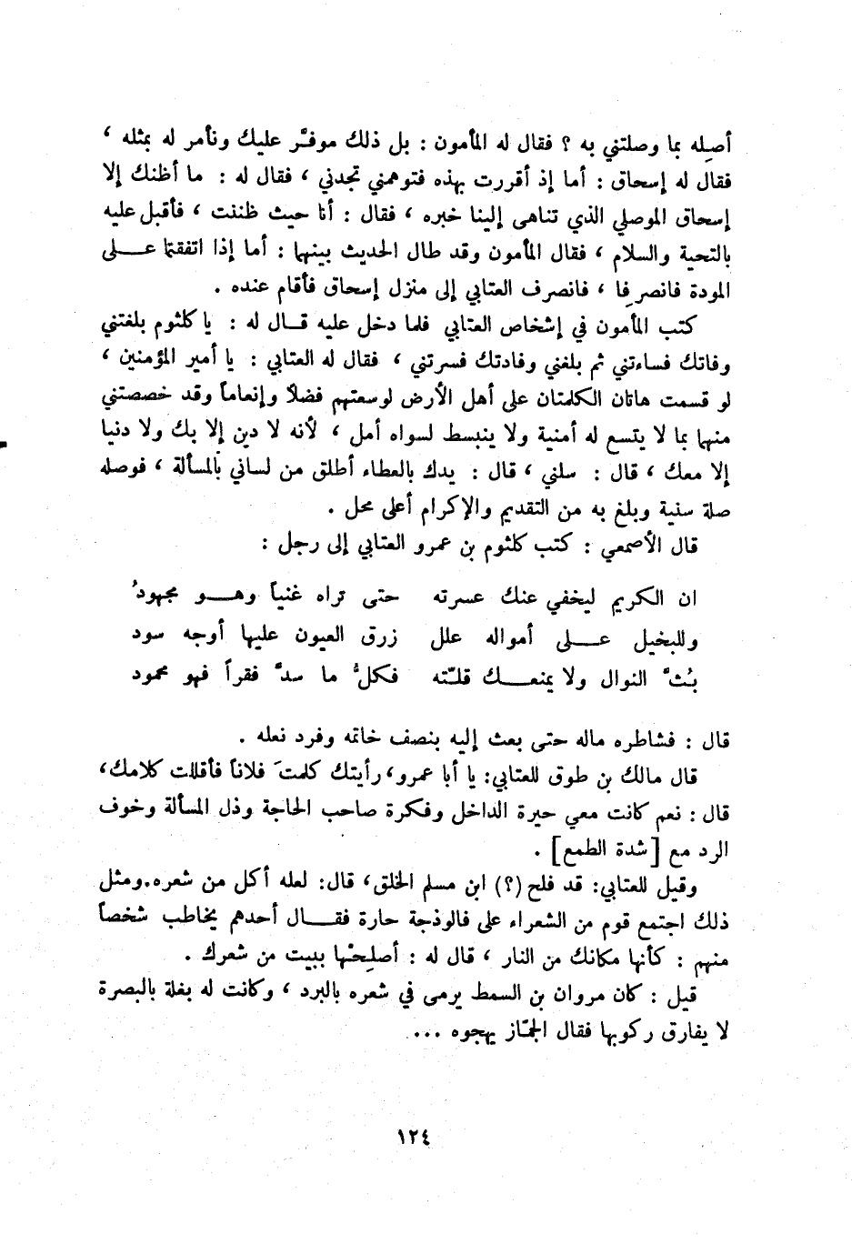 كتب المأمون في إشخاص العتابي فلما دخل عليه قال له: يا كلثوم بلغني وفاتك فساءني ثم يلغني وفادتك فسرتني، فقال له العتابي: يا أمير المؤمنين، لو قسمت هاتان الكلمتان على أهل الأرض لوسعتهم فضلا وإنعاما وقد خصصتني منهما بما لا يتسع له أمنية ولا ينبسط لسواه أمل، لأنه لا دين إلا بك ولا دنيا إلا معك، قال: سلني، قال: يدك بالعطاء أطلق من لساني بالمسألة، فوصله صلة سنية وبلغ به من التقديم والإكرام أعلى محل.
