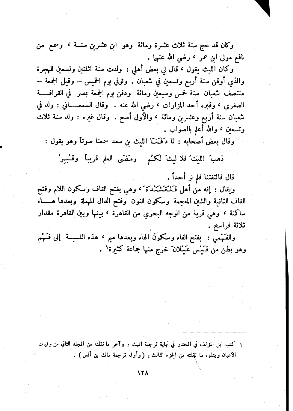 (1) كتب ابن المؤلف في المختار في نهاية ترجمة الليث: " آخر ما نقلته من المجلد الثاني من وفيات الأعيان ويتلوه ما نقلته من الجزء الثالث " (وأوله ترجمة مالك بن أنس) .
