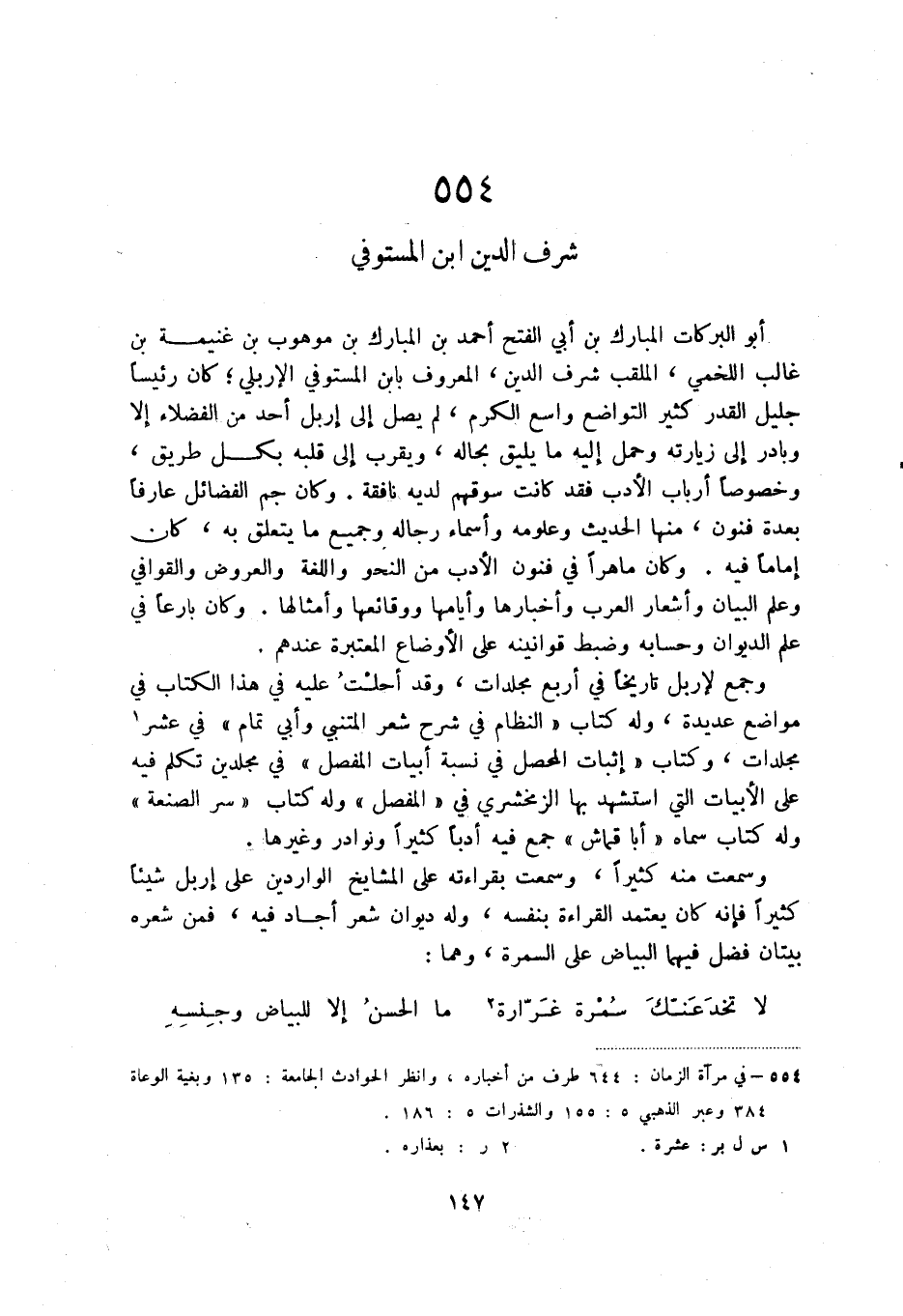 وجمع لإربل تاريخا في أربع مجلدات، وقد احلت عليه في هذا الكتاب في مواضع عديدة، وله كتاب النظام في شرح شعر المتنبي وأبي تمام في عشر (1) مجلدات، وكتاب إثبات المحصل في نسبة أبيات المفصل في مجلدين تكلم فيه على الأبيات التي استشهد بها الزمخشري في المفصل وله كتاب سر الصنعة وله كتاب سماه أبا قماش جمع فيه أدبا كثيرا ونوادر وغيرها.