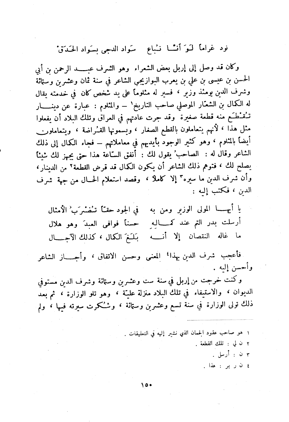 نود غراما لو أنا نباع ... سواد الدجى بسواد الحدق وكان قد وصل إلى إربل بعض الشعراء وهو الشرف عبد الرحمن بن أبي الحسن بن عيسى بن علي بن يعرب البوازيجي الشاعر في سنة ثمان وعشرين وستمائة وشرف الدين يومئذ وزير، فسير له مثلوما على يد شخص كان في خدمته يقال له الكمال بن الشعار الموصلي صاحب التاريخ (1) - والمثلوم: عبارة عن دينار تقطع منه قطعة صغيرة وقد جرت عادتهم في العراق وتلك البلاد أن يفعلوا مثل هذا، لأنهم يتعاملون بالقطع الصغار، ويسمونها القراضة، ويتعاملون أيضا بالمثلوم، وهو كثير الوجود بأيديهم في معاملاتهم - فجاء الكمال إلى ذلك الشعر وقال له: الصاحب يقول لك: أنفق الساعة هذا حتى يجهز لك شيئا يصلح لك، فتوهم ذلك الشاعر أن يكون الكمال قد قرض القطعة (2) من الدينار، وأن شرف الدين ما سيره (3) إلا كاملا، وقصد استعلام الحال من جهة شرف الدين، فكتب إليه: