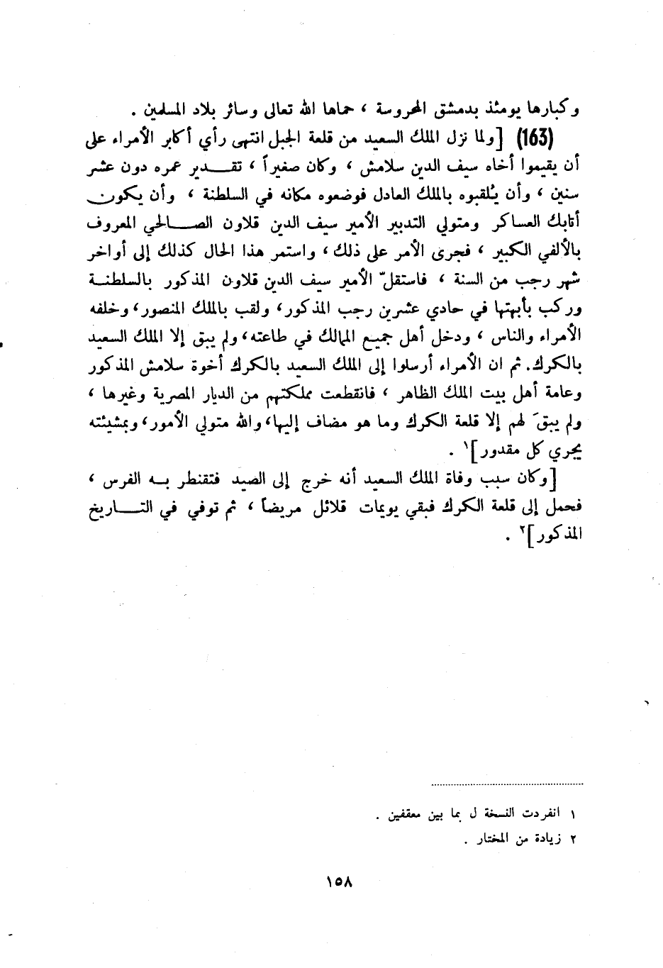 (163) [ولما نزل الملك السعيد من قلعة الجبل انتهى رأي أكابر الأمراء على أن يقيموا اخاه سيف الدسن سلامش، وكان صغيرا، تقدير عمره دون عشر سنين، وأن يلقبوه بالملك العادل فوضعوه مكانه في السلطنة، وأن يكون اتابك العساكر ومتولي التدبير الأمير سيف الدين قلاون الصالحي المعروف بالألفي الكبير، فجرى الأمر على ذلك، واستمر هذا الحال كذلك إلى أواخر شهر رجب من السنة، فاستقل الأمير سيف الدين قلاون المذكور بالسلطنة وركب بأبهتها في حادي عشرين رجب المذكور، ولقب بالملك المنصور، وخلفه الأمراء والناس، ودخل أهل جميع المماليك في طاعته، ولم يبق إلا الملك السعيد بالكرك. ثم ان الأمراء أرسلوا إلى الملك السعيد بالكرك أخوه سلامش المذكور وعامة أهل بيت الملك الظاهر، فانقطعت مملكتهم من الديار المصرية وغيرها، ولم يبق لهم الا قلعة الكرك وما هو مضاف اليها، والله متولي الأمور، وبمشيئته يجري كل مقدور] (1) .