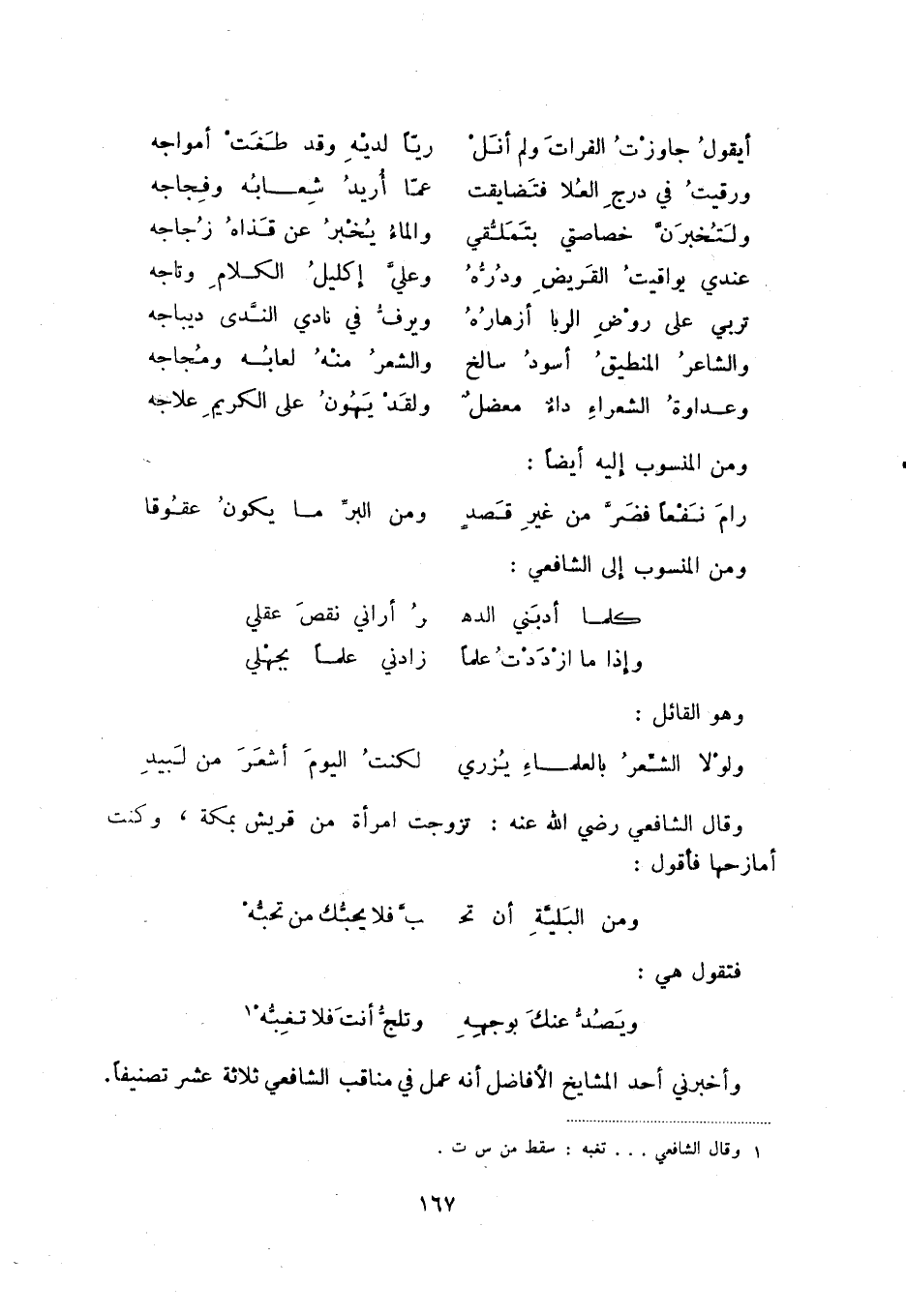 ويصد عنك بوجهه ... وتلج أنت فلا تغبه (1) وأخبرني أحد المشايخ الأفاضل أنه عمل في مناقب الشافعي ثلاثة عشر تصنيفا.