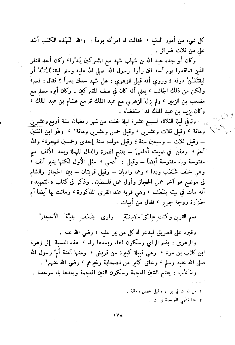 وتوفي ليلة الثلاثاء لسبع عشرة ليلة خلت من شهر رمضان سنة أربع وعشرين ومائة، وقيل ثلاث وعشرين، وقيل خمس وعشرين ومائة (1) ، وهو ابن اثنتين - وقيل ثلاث - وسبعين سنة، وقيل مولده سنة إحدى وخمسين للهجرة، والله أعلم، ودفن في ضيعته أدامي بفتح الهمزة والدال المهملة وبعد الألف ميم مفتوحة وياء مفتوحة أيضا وقيل: أدمي، مثل الأول لكنها بغير ألف، وهي خلف شغب وبدا، وهما واديان وقيل قريتان بين الحجاز والشام في موضع هو آخر عمل الحجاز وأول عمل فلسطين. وذكر في كتاب التمهيد أنه مات في بيته بنعف، وهي قرية عند القرى المذكورة، وماتت بها أيضا أم حزرة زوجة جرير، فقال من أبيات: