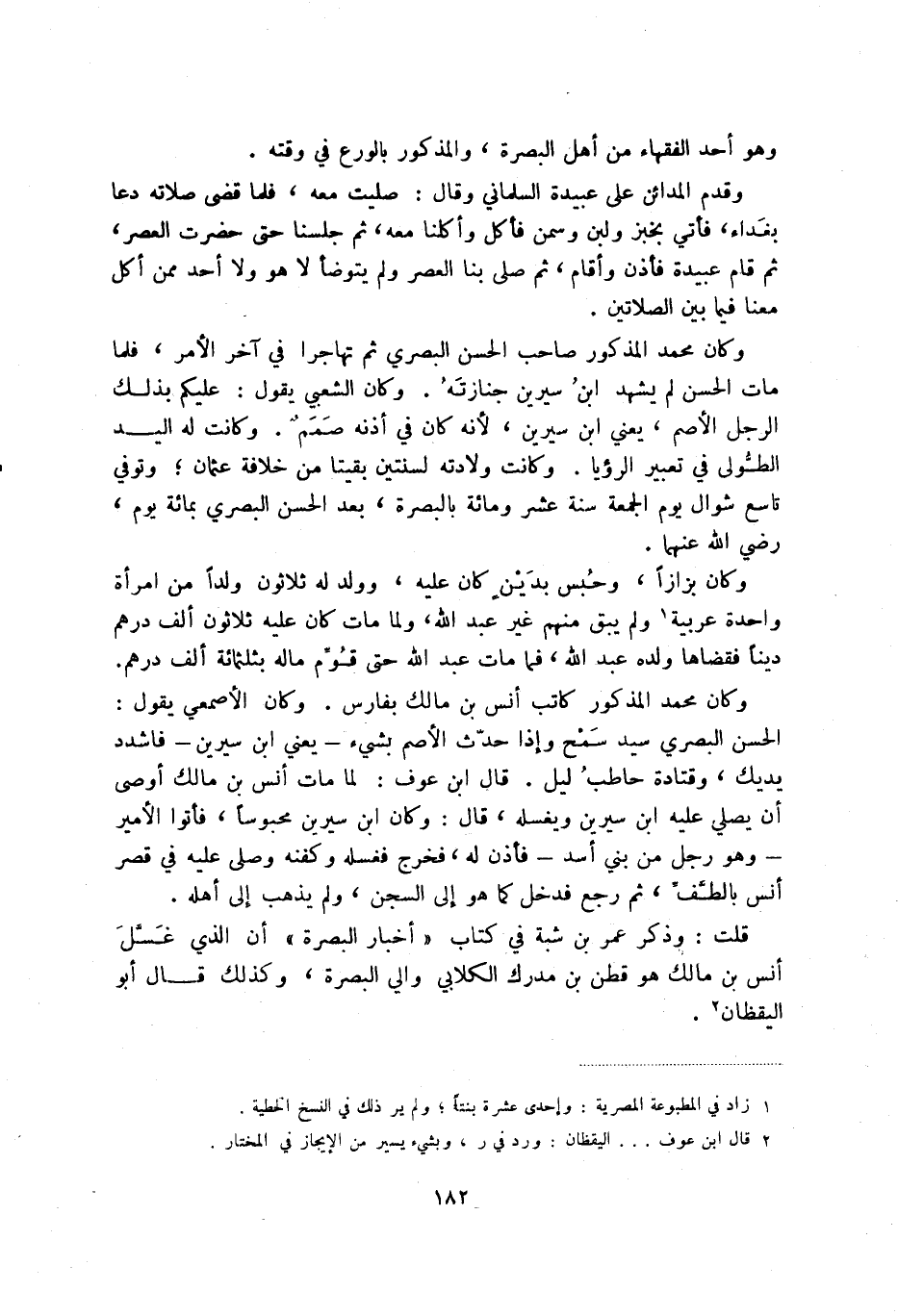 وكان محمد المذكور كاتب أنس بن مالك بفارس. وكان الأصمعي يقول: الحسن البصري سيد سمح وإذا حدث الأصم بشيء - يعني ابن سيرين - فاشدد يديك، وقتادة حاطب ليل. قال ابن عوف: لما مات أنس بن مالك أوصى أن يصلي عليه ابن سيرين ويغسله، قال: وكان ابن سيرين محبوسا، فأتوا الأمير - وهو رجل من بني أسد - فأذن له، فخرج فغسله وكفنه وصلى عليه في قصر أنس بالطف، ثم رجع فدخل كما هو إلى السجن، ولم يذهب إلى أهله.
