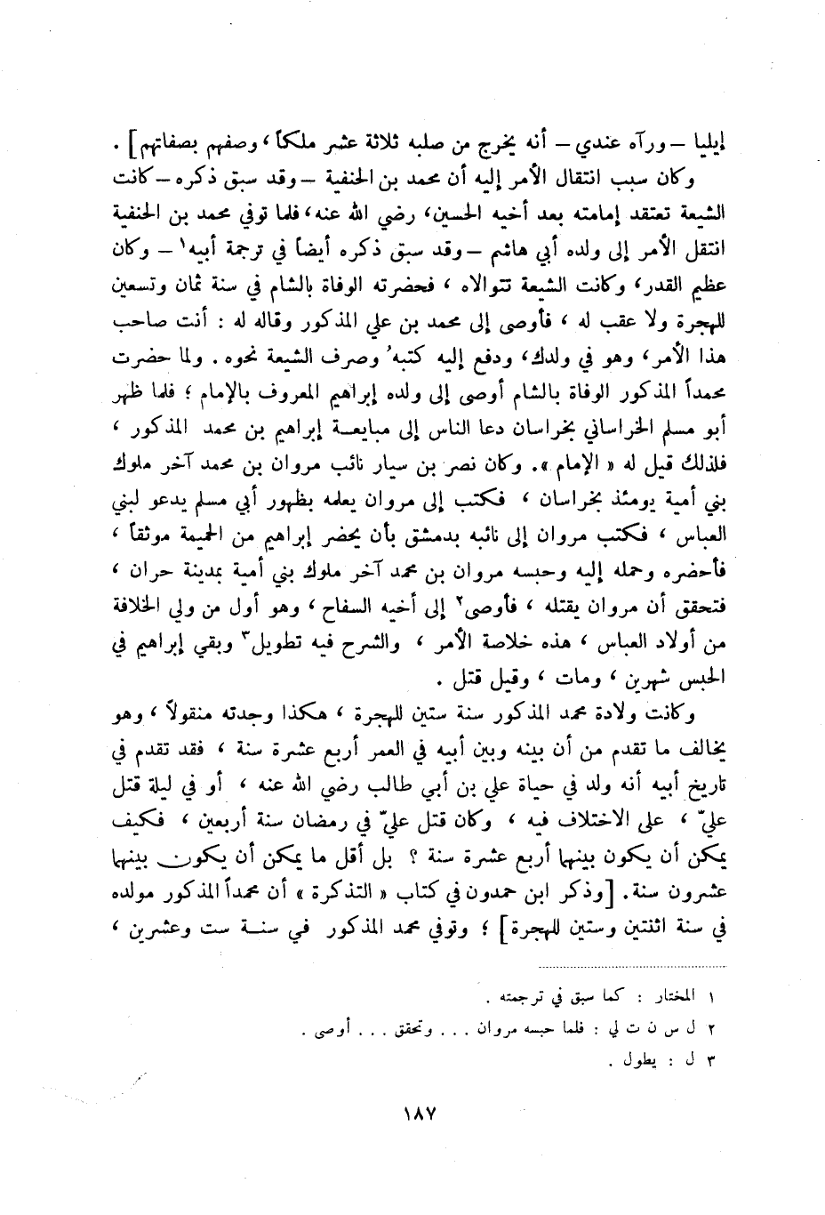 وكان سبب انتقال الأمر إليه أن محمد بن الحنيفية - وقد سبق ذكره - كانت الشيعة تعتقد إمامته بعد أخيه الحسين، رضي الله عنه، فلما توفي محمد بن الحنيفية انتقل الأمر إلى ولده أبي هاشم - وقد سبق ذكره أيضا في ترجمة أبيه (1) - وكان عظيم القدر، وكانت الشيعة تتوالاه، فحضرته الوفاة بالشام في سنة ثمان وتسعين للهجرة ولا عقب له، فأوصى إلى محمد بن علي المذكور وقاله له: انت صاحب هذا الأمر، وهو في ولدك، ودفع إليه كتبه وصرف الشيعة نحوه. ولما حرض محمدا المذكور الوفاة بالشام أوصى إلى ولده إبراهيم المعروف بالإمام، فلما ظهر أبو مسلم الخراساني بخراسان دعا الناس إلى مبايعة إبراهيم بن محمد المذكور، فلذلك قيل له الإمام. وكان نصر بن سيار نائب مروان بن محمد آخر ملوك بني أمية يومئذ بخراسان، فكتب إلى مروان يعلمه بظهور أبي مسلم يدعو لبني العباس. فكتب مروان إلى نائبه بدمشق بأن يحضر إبراهيم من الحميمة موثقا، فأحضره وحمله إليه وحبسه مروان بن محمد آخر ملوك بني امية بمدينةة حران، فتحقق أن مروان يقتله، فأوصى (2) إلى أخيه السفاح، وهو أول من ولي الخلافة من اولاد العباس، هذه خلاصة الأمر، والشرح فيه تطويل (3) وبقي إبراهيم في الحبس شهرين، ومات وقيل قتل.
