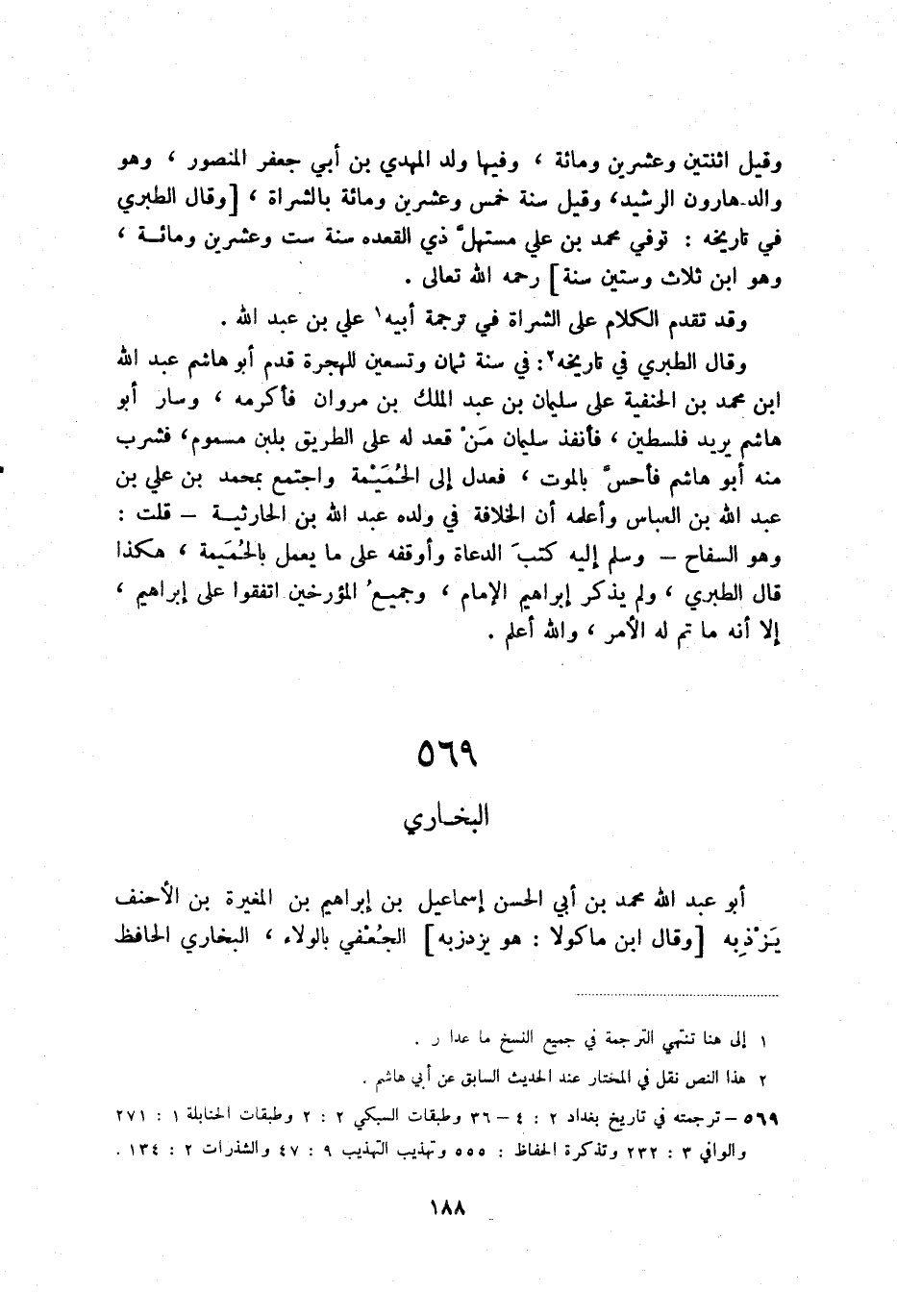 وقال الطبري في تاريخه (2) : في سنة ثمان وتسعين للهجرة قدم أبو هاشم عبد الله ابن محمد بن الحنفية على سليمان بن عبد الملك بن مروان فأكرمه، وسار أبو هاشم يريد فلسطين، فأنقذ سليمان من قعد له على الطريق بلبن مسموم، فشرب منه أبو هاشم فأحس بالموت، فعدل إلى الحميمة واجتمع بمحمد بن علي بن عبد الله بن العباس وأعلمه ان الخلافة في ولده عبد الله بن الحارثية - قلت: وهو السفاح - وسلم إليه كتب الدعاة وأوقفه على ما يعمل بالحميمة، هكذا قال الطبري، ولم يذكر إبراهيم الإمام، وجميع المؤرخين اتفقوا على إبراهيم، إلا أنه ما تم له الأمر، والله أعلم.
