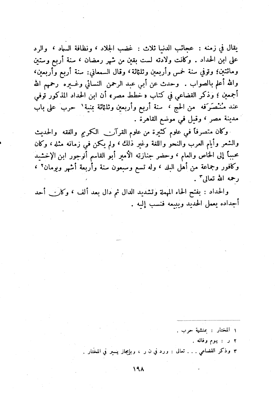يقال في زمنه: عجائب الدنيا ثلاث: غضب الجلاد، ونظافة السماد، والرد على ابن الحداد. وكانت ولادته لست بقين من شهر رمضان، سنة أربع وستين ومائتين، وتوفي سنة خمس وأربعين وثلثمائة، وقال السمعاني: سنة أربع وأربعين، والله أعلم بالصواب. وحدث عن أبي عبد الرحمن النسائي وغيره رحمهم الله أجمعين، وذكر القضاعي في كتاب خطط مصر ان ابن الحداد المذكور توفي عند منصرفه من الحج، سنة أربع وأربعين وثلثمائة بمنية (1) حرب على باب مدينة مصر، وقيل في موضع القاهرة.