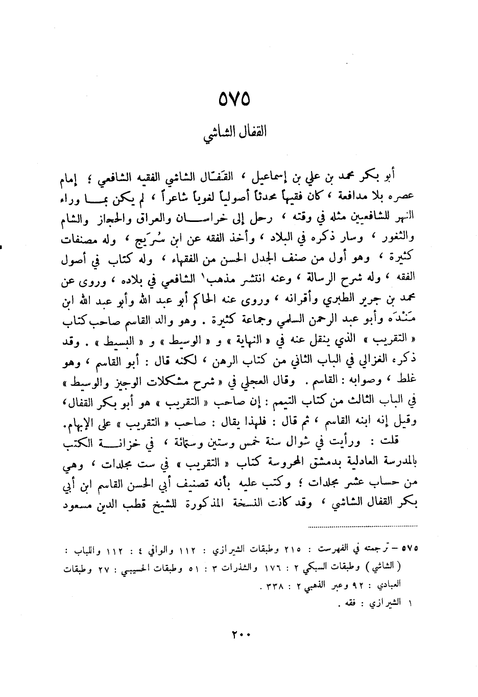 (1) ترجمته في الفهرست: 215 وطبقات الشيرازي: 112 والوافي 4: 112 واللباب: (الشاشي) وطبقات السبكي 2: 176 والشذرات 3: 51 وطبقات الحسيبي: 27 وطبقات العبادي: 92 وعبر الذهبي 2: 338.