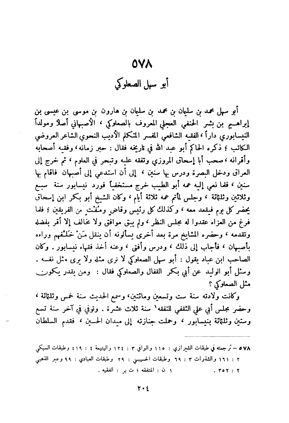 أبو سهل محمد بن سليمان بن محمد بن سليمان بن هارون بن موسى بن عيسى بن إبراهيم بن بشر الحنفي العجلي المعروف بالصعلوكي، الأصبهاني أصلا ومولدا النيسابوري دارا، الفقيه الشافعي المفسر المتكلم الأديب النحوي الشاعر العروضي الكاتب، ذكره الحاكم أبو عبد الله في تاريخه فقال: حبر زمانه، وفقيه أصحابه وأقرانه، صحب أبا إسحاق المرزوي وتفقه عليه وتبحر في العلوم، ثم خرج إلى العراق ودخل البصرة ودرس بها سنين، إلى أن استدعي إلى أصبهان فاقام بها سنين، فلما نعي إليه عمه أبو الطيب خرج مستخفيا فورد نيسابور سنة سبع وثلاثين وثلثمائة، وجلس لمأتم عمه ثلاثة أيام، وكان الشيخ أبو بكر ابن إسحاق يحضر كل يوم فيقعد معه، وكذلك كل رئيس وقاض ومفت من الفريقين، فلما فرغ من العزاء عقدوا له مجلس النظر، ولم يبق موافق ولا مخالف إلا أقربفضله وتقدمه، وحضره المشايخ مرة بعد أخرى يسألونه أن ينقل من خلفهم وراءه بأصبهان، فأجاب إلى ذلك، ودرس وأفتى، وعنه أخذ فقهاء نيسابور. وكان الصاحب ابن عباد يقول: أبو سهل الصعلوكي لا نرى مثله ولا يرى مثل نفسه. وسئل أبو الوليد عن أبي بكر القفال والصعلوكي فقال: ومن يقدر يكون مثل الصعلوكي