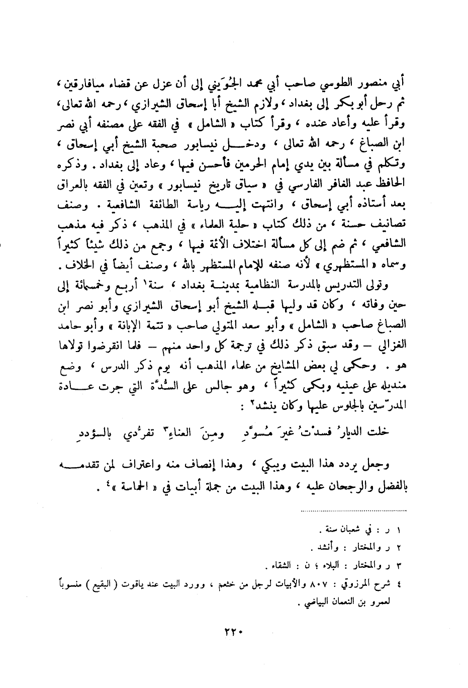 خلت الديار فسدت غير مسود ... ومن العناء (3) تفردي بالسؤدد وجعل يردد هذا البيت ويبكي، وهذا إنصاف منه واعتراف لمن تقدمه بالفضل والرجحان عليه، وهذا البيت من جملة أبيات في الحماسة (4) .